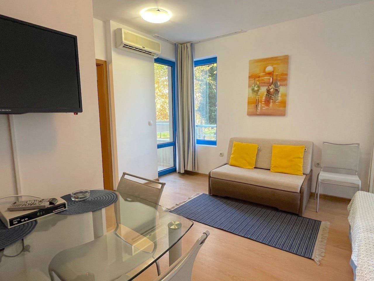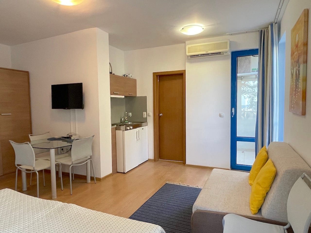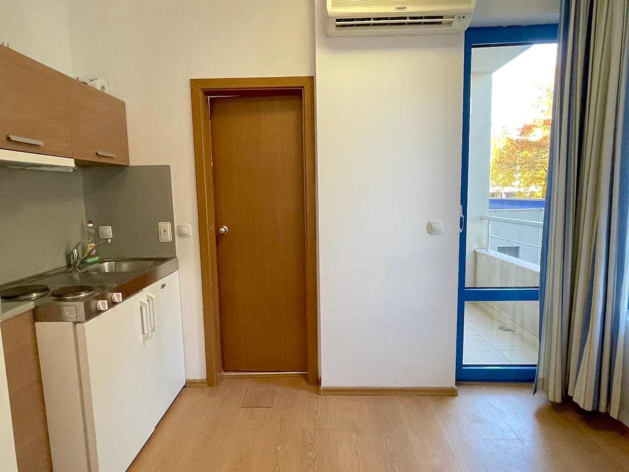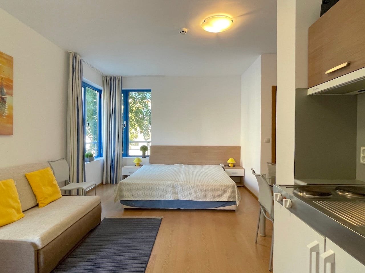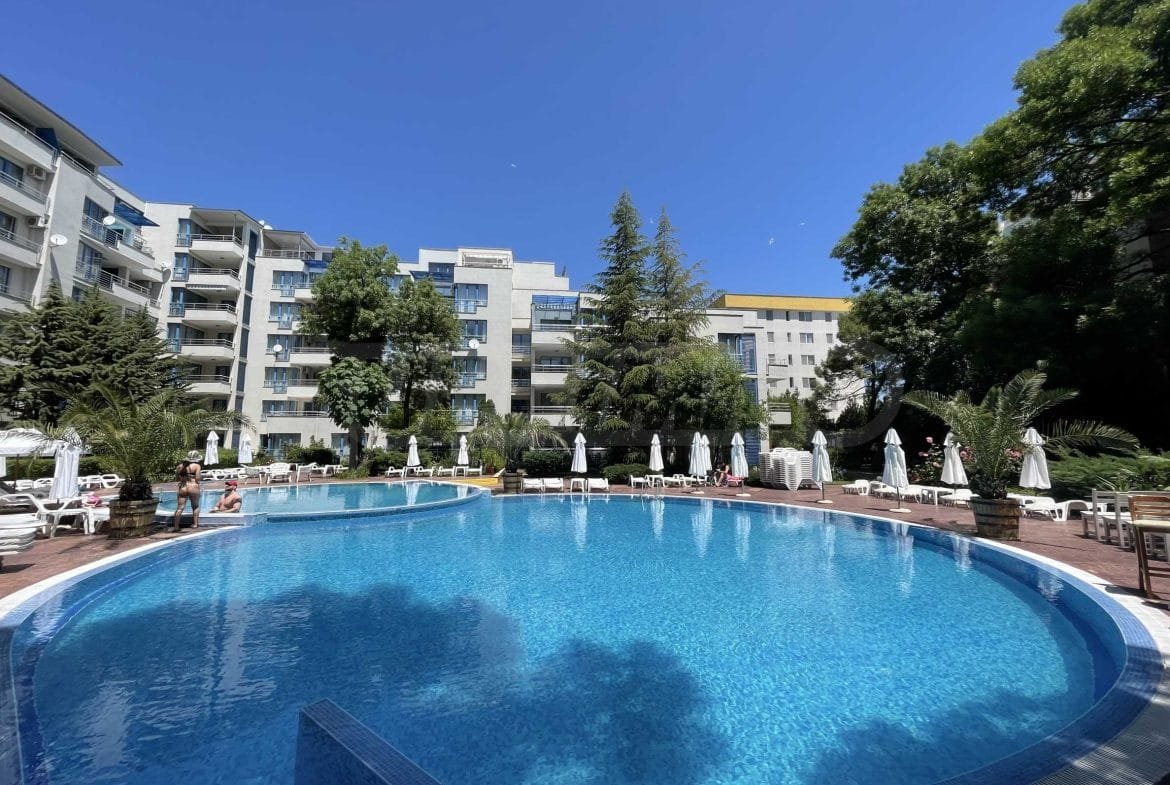 Jednopokojowe mieszkanie typu studio o powierzchni całkowitej 40 m2 i powierzchni użytkowej 34 m2, oferowane wykonczone i w pelni umeblowane. Mieszkanie znajduje sie na 1 piętrze kompleksu Excelsior w Słonecznym Brzegu i składa sie z przedpokoju-korytarza, salonu z aneksem kuchennym, łazienki z WC oraz balkonu z widokiem na sąsiednie zabudowania.