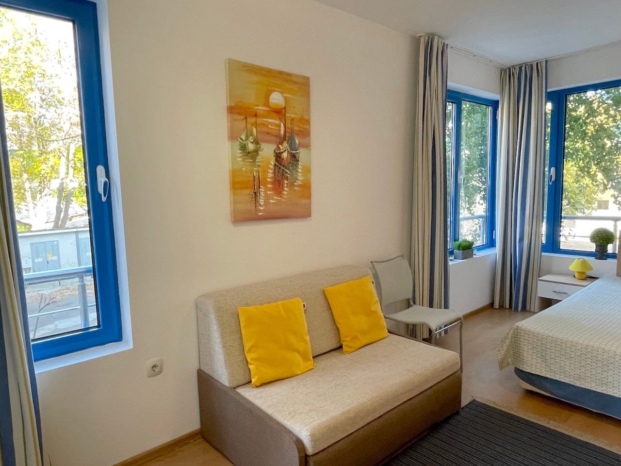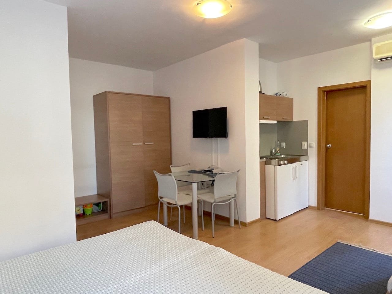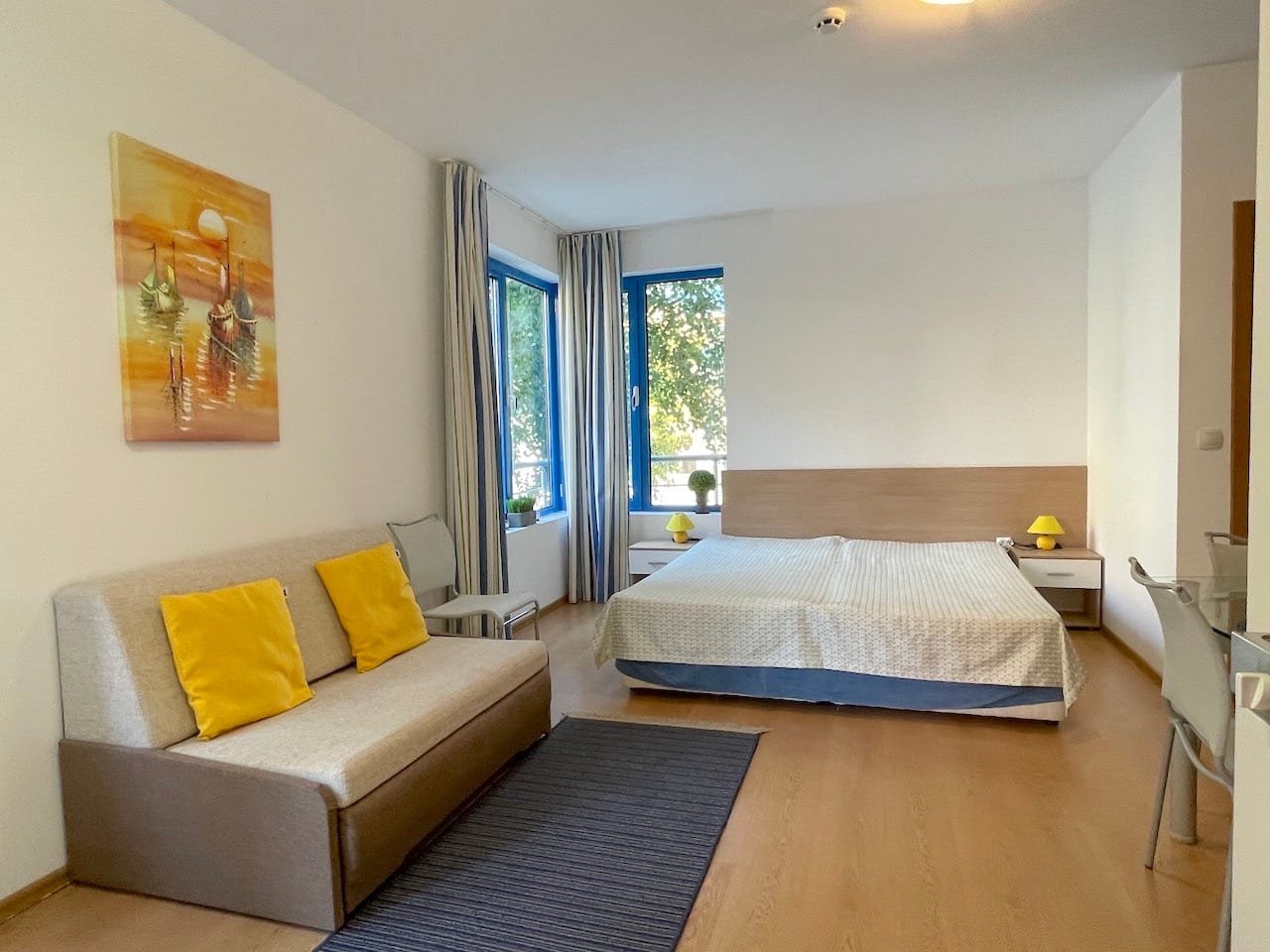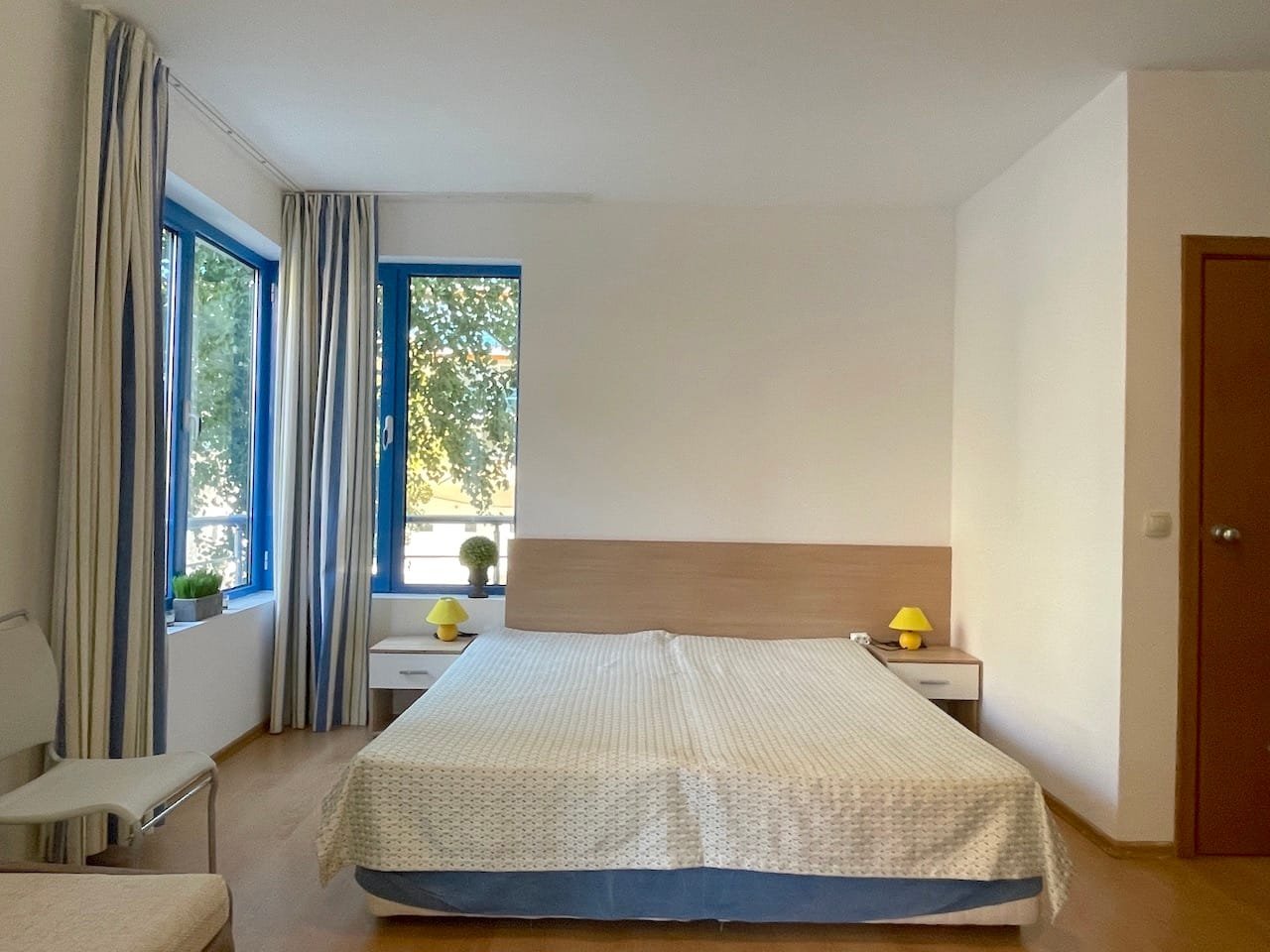Jednopokojowe mieszkanie typu studio o powierzchni całkowitej 40 m2 i powierzchni użytkowej 34 m2, oferowane wykonczone i w pelni umeblowane. Mieszkanie znajduje sie na 1 piętrze kompleksu Excelsior w Słonecznym Brzegu i składa sie z przedpokoju-korytarza, salonu z aneksem kuchennym, łazienki z WC oraz balkonu z widokiem na sąsiednie zabudowania.