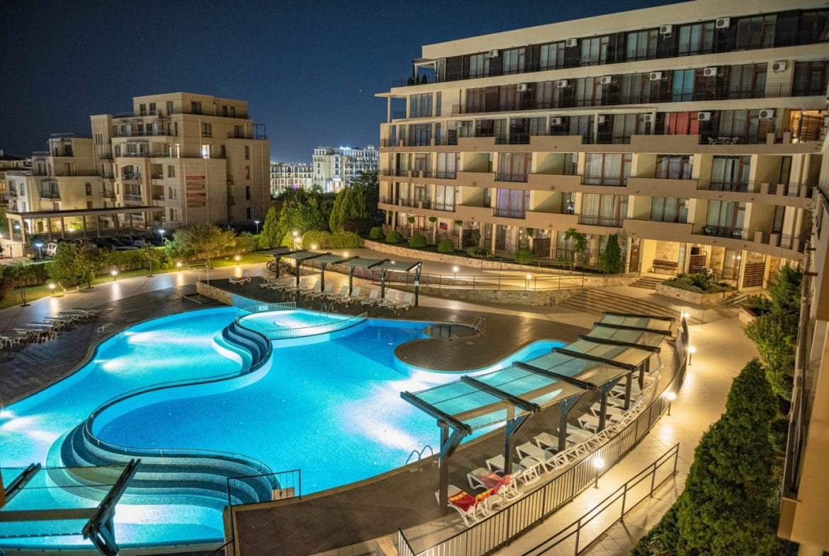 Luxor complex is located approx. 250meters from the beach, just across the street from Mercury supermarket in Sveti Vlas. The complex offers owners and guests outdoor pool with sun loungers, restaurant, parking. It is suitable for year-round living and renting.