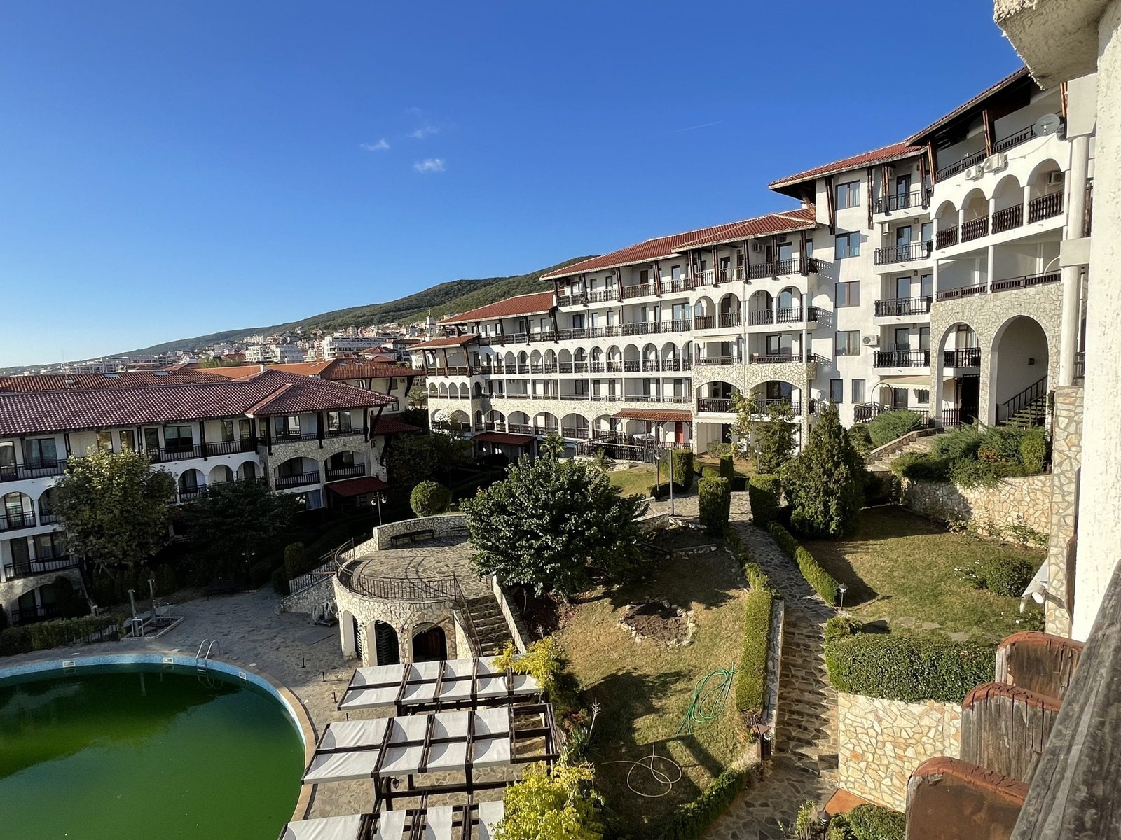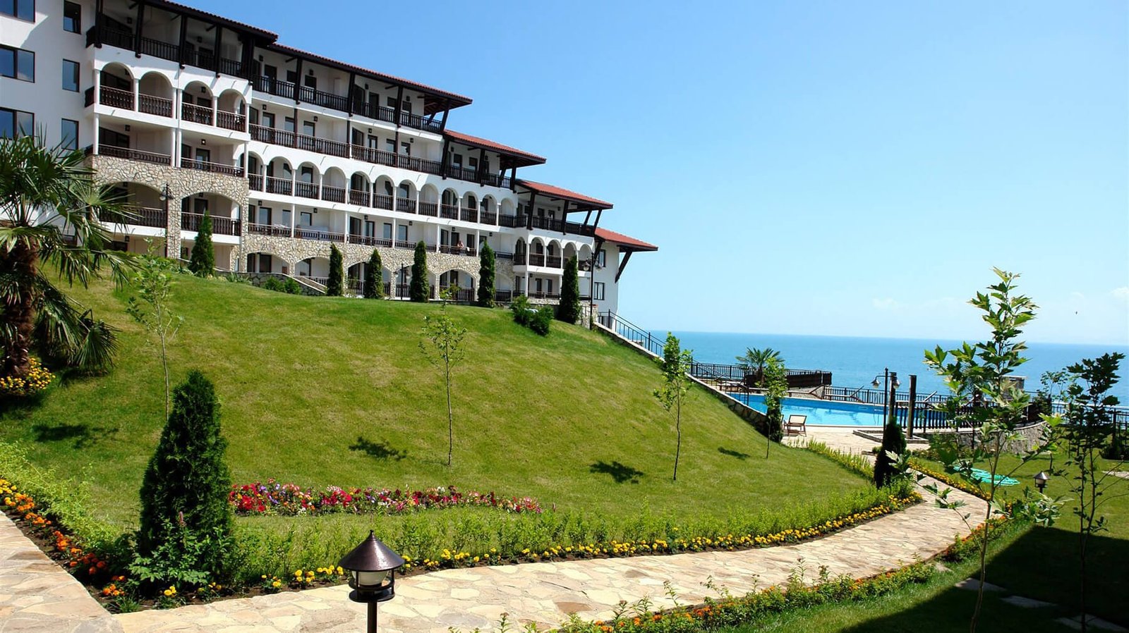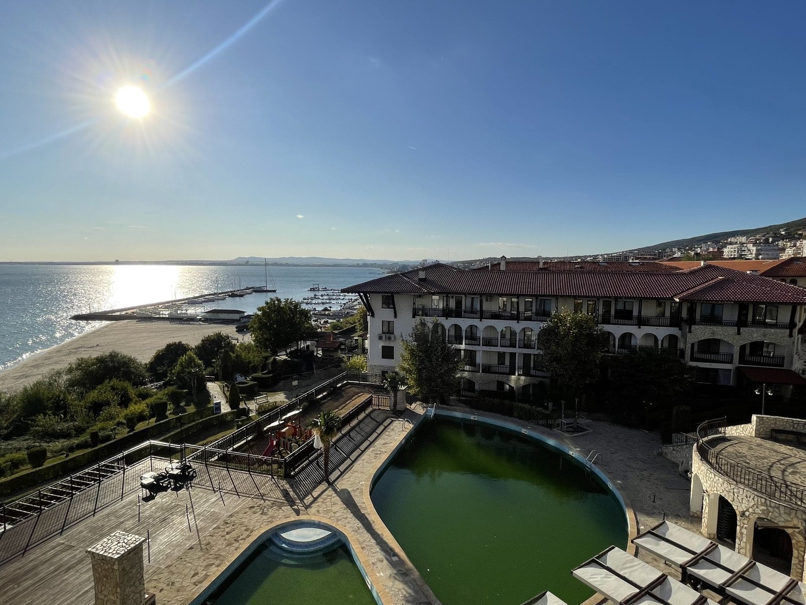 Kompleks posiada dwa oddzielne baseny dla dorosłych i dla dzieci, otoczone zachęcającymi terenami zielonymi z widokiem na morze. Kompleks ma białe, piękne elewacje, a także na jego terenie znajdują się wygodne ławki do odpoczynku, aqua bar, sklep, restauracja, plac zabaw dla dzieci, parking i kręta ścieżka do plaży.