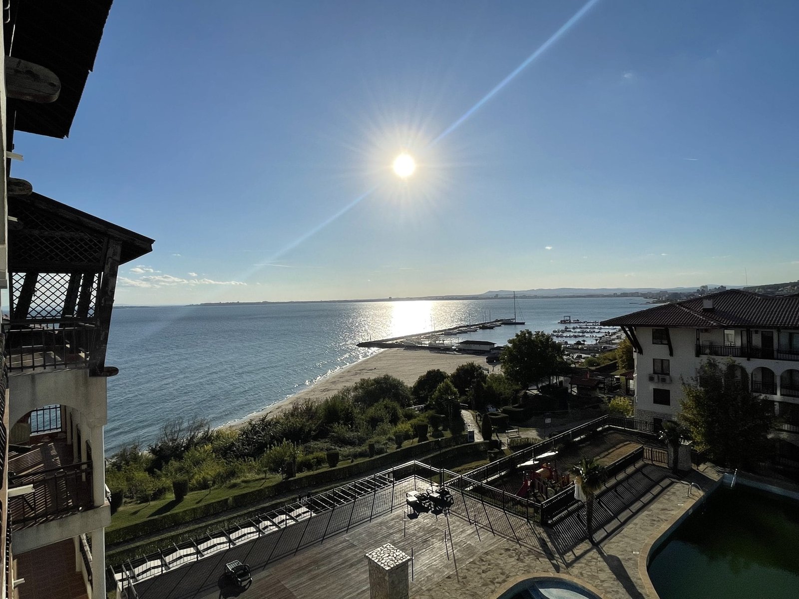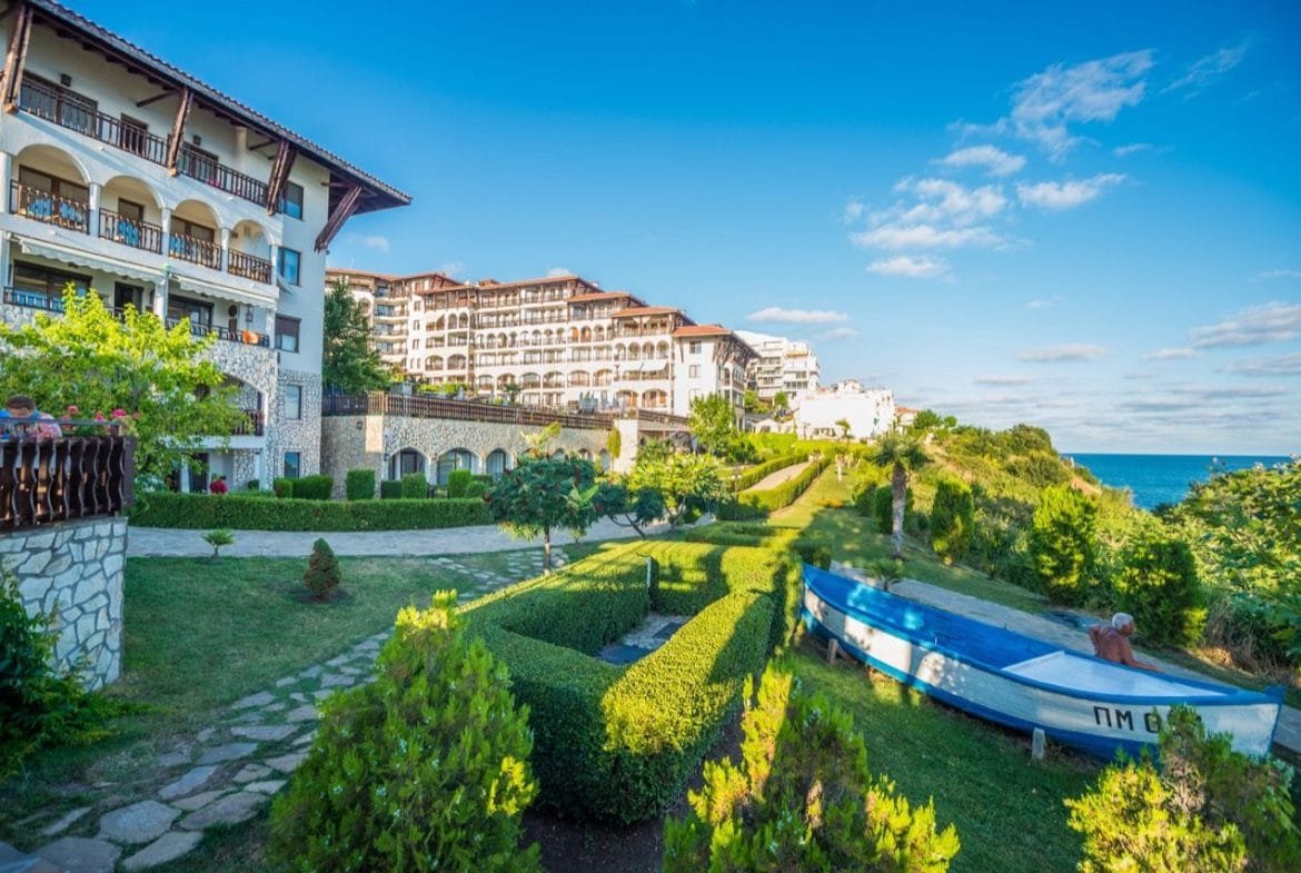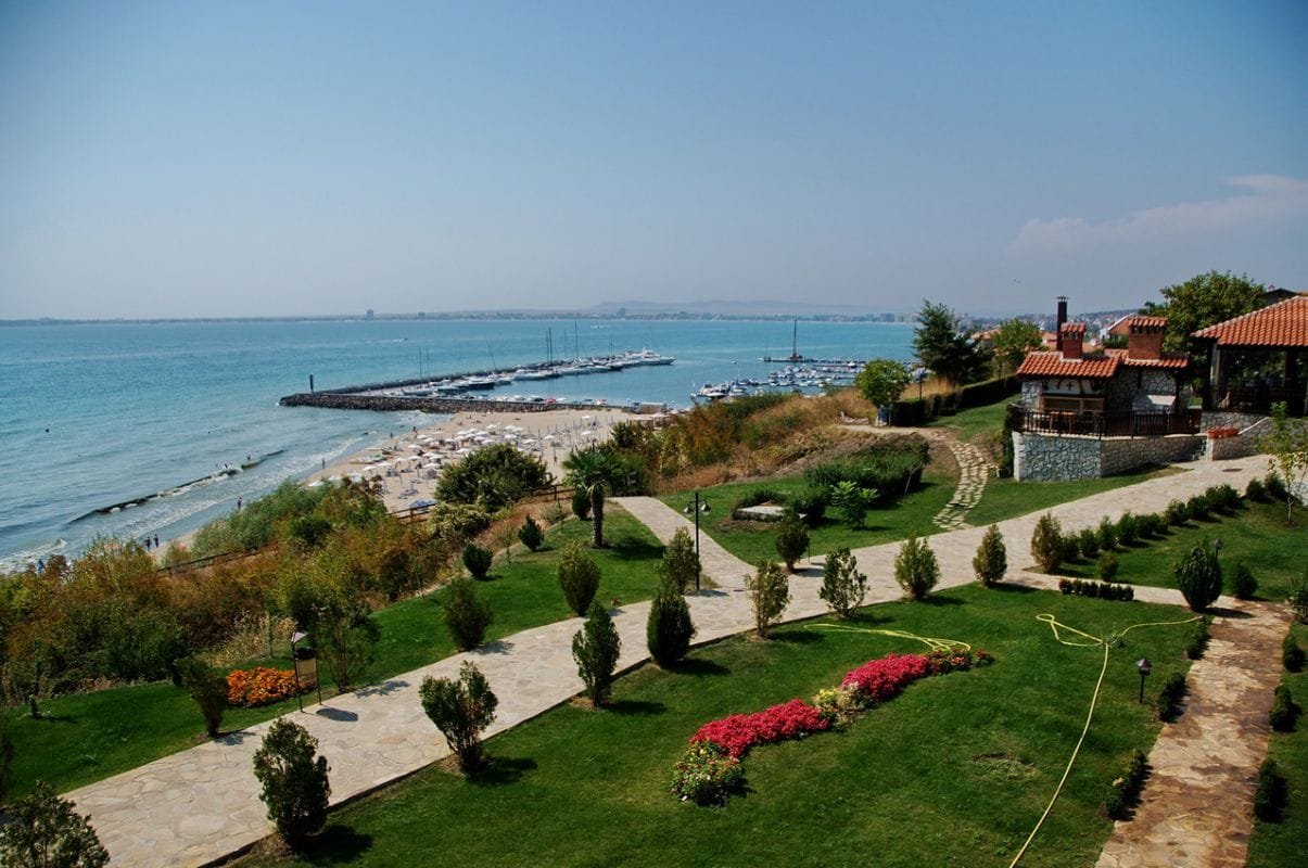 Kompleks posiada dwa oddzielne baseny dla dorosłych i dla dzieci, otoczone zachęcającymi terenami zielonymi z widokiem na morze. Kompleks ma białe, piękne elewacje, a także na jego terenie znajdują się wygodne ławki do odpoczynku, aqua bar, sklep, restauracja, plac zabaw dla dzieci, parking i kręta ścieżka do plaży.