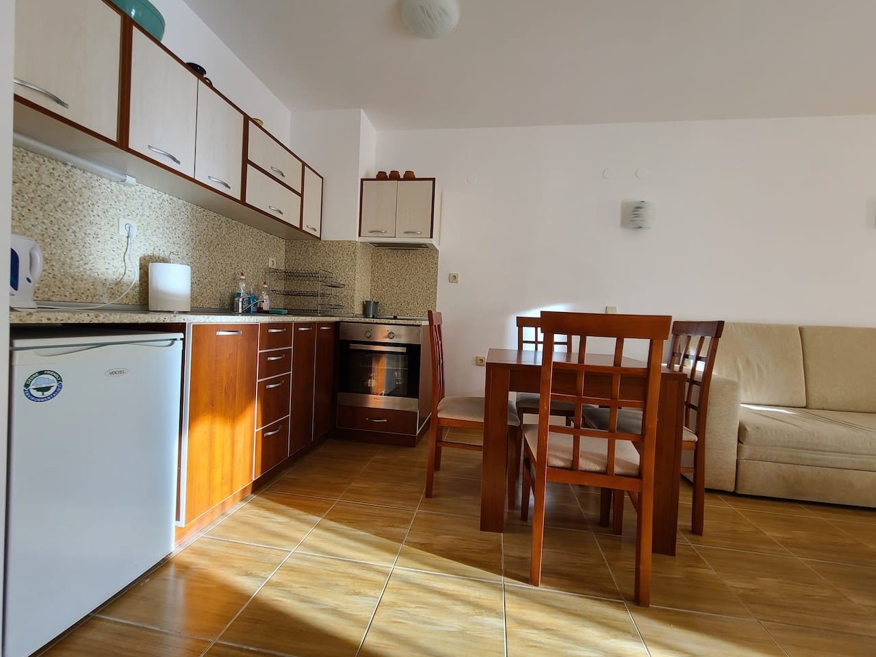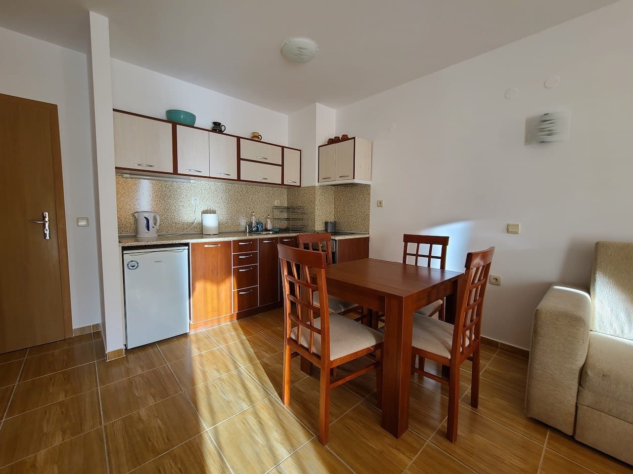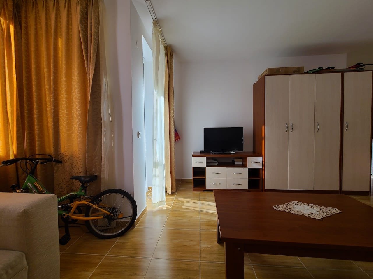 1 bedroom apartment, comfortably furnished and with a very good layout with a total size with common parts of 68.61 m2 and a built up area of 58.27 m2. It consists of a nice living room with a kitchenette with an exit to a terrace, bedroom, and a bathroom.