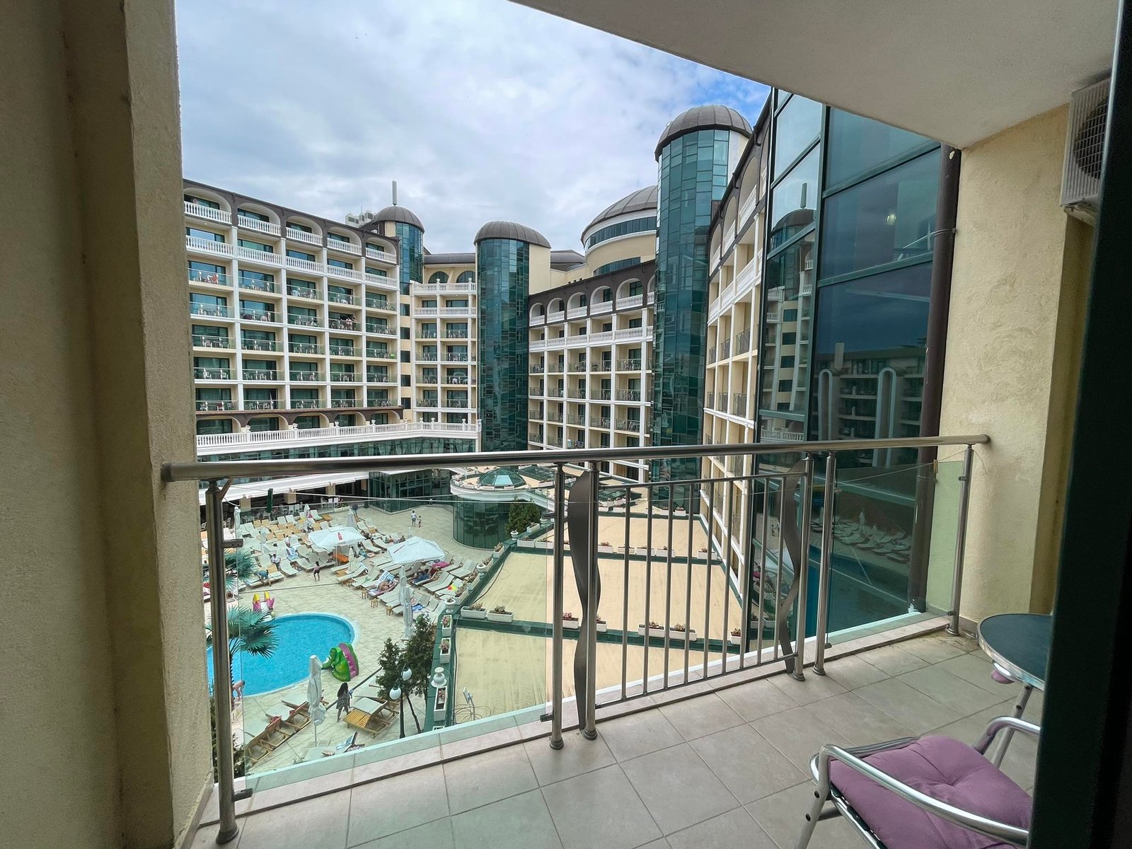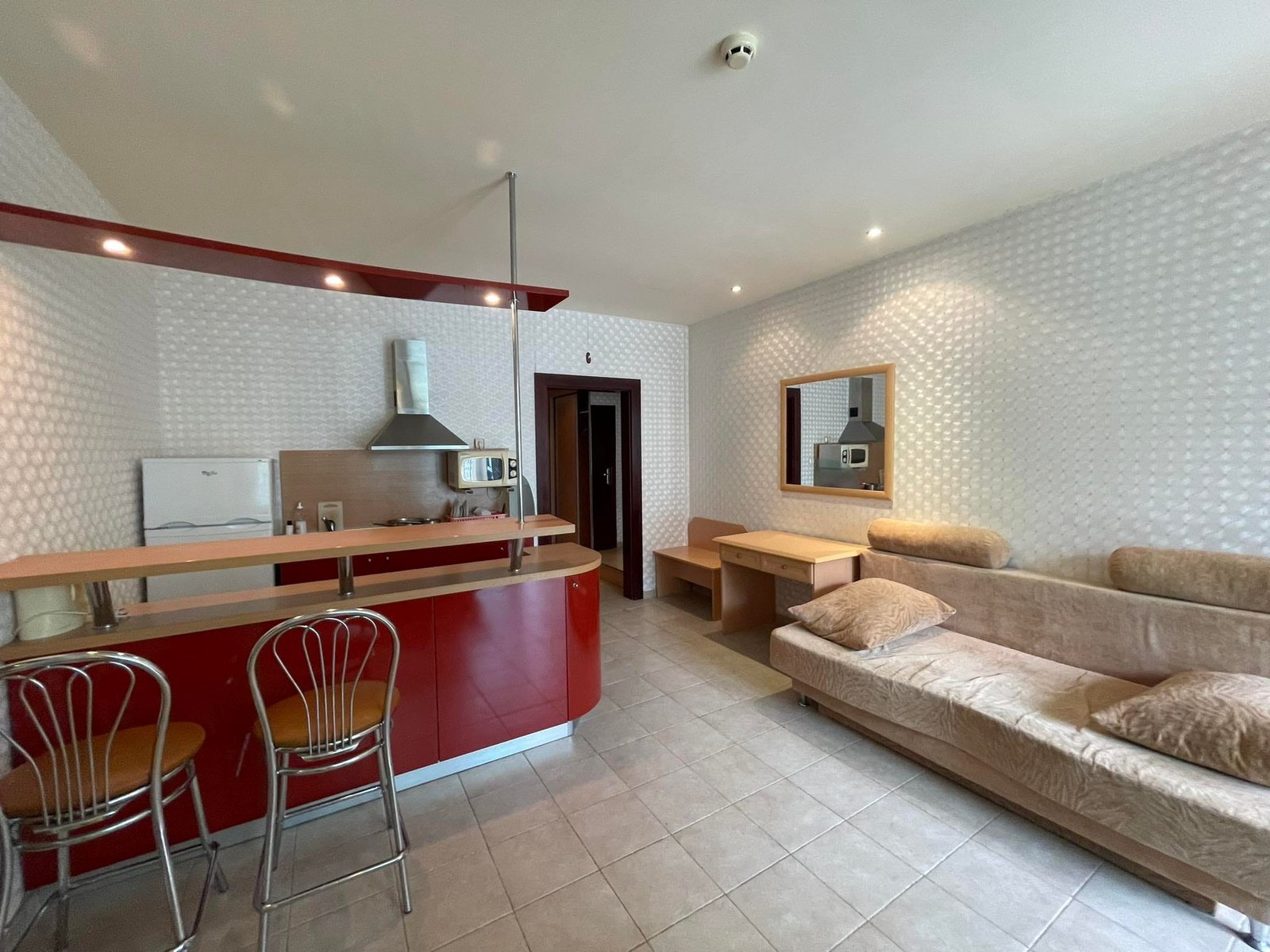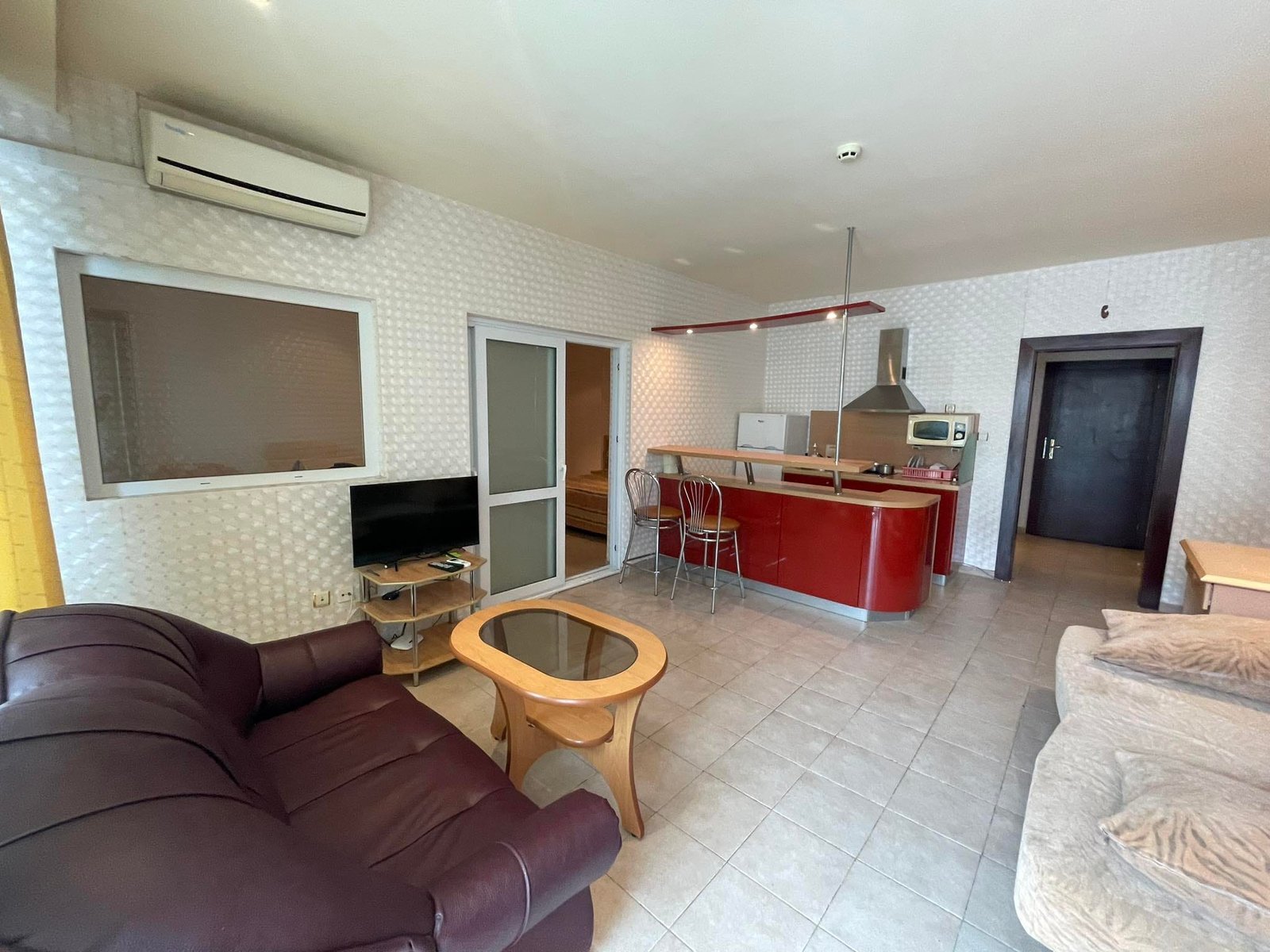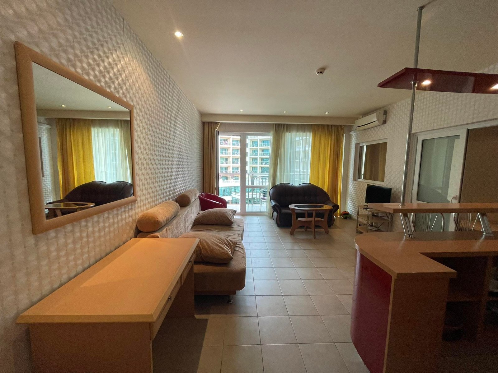 One-bedroom apartment with a total size with common parts of 82.15 sq.m., located on the 5th floor in Miramar Palace. The apartment consists of a large living room with a kitchenette, a bedroom, a wide corridor with a closet, an entrance hall, 2 bathrooms with a toilet, one of which has a bathtub, and a terrace with a view of the pool and the neighboring buildings.