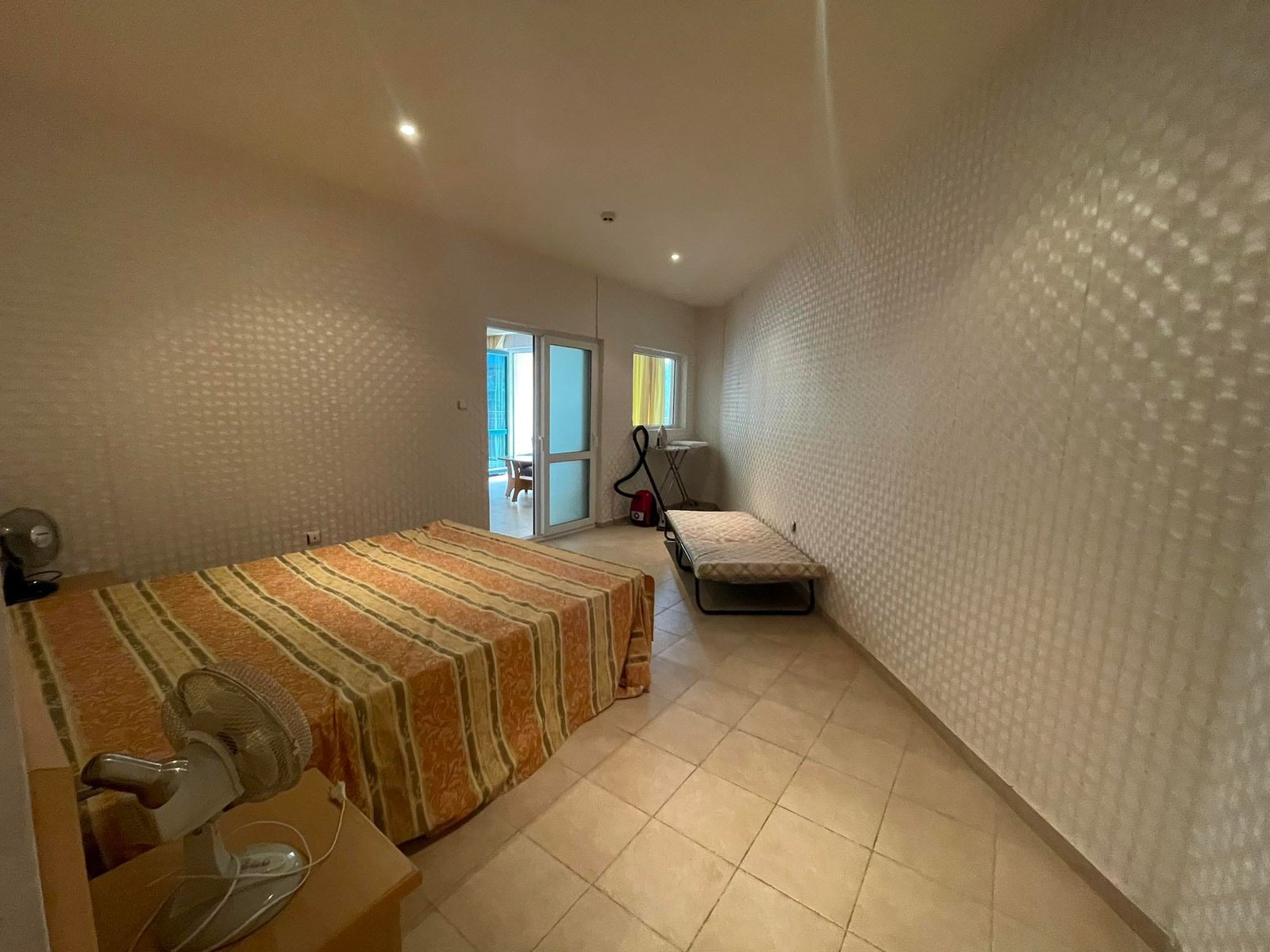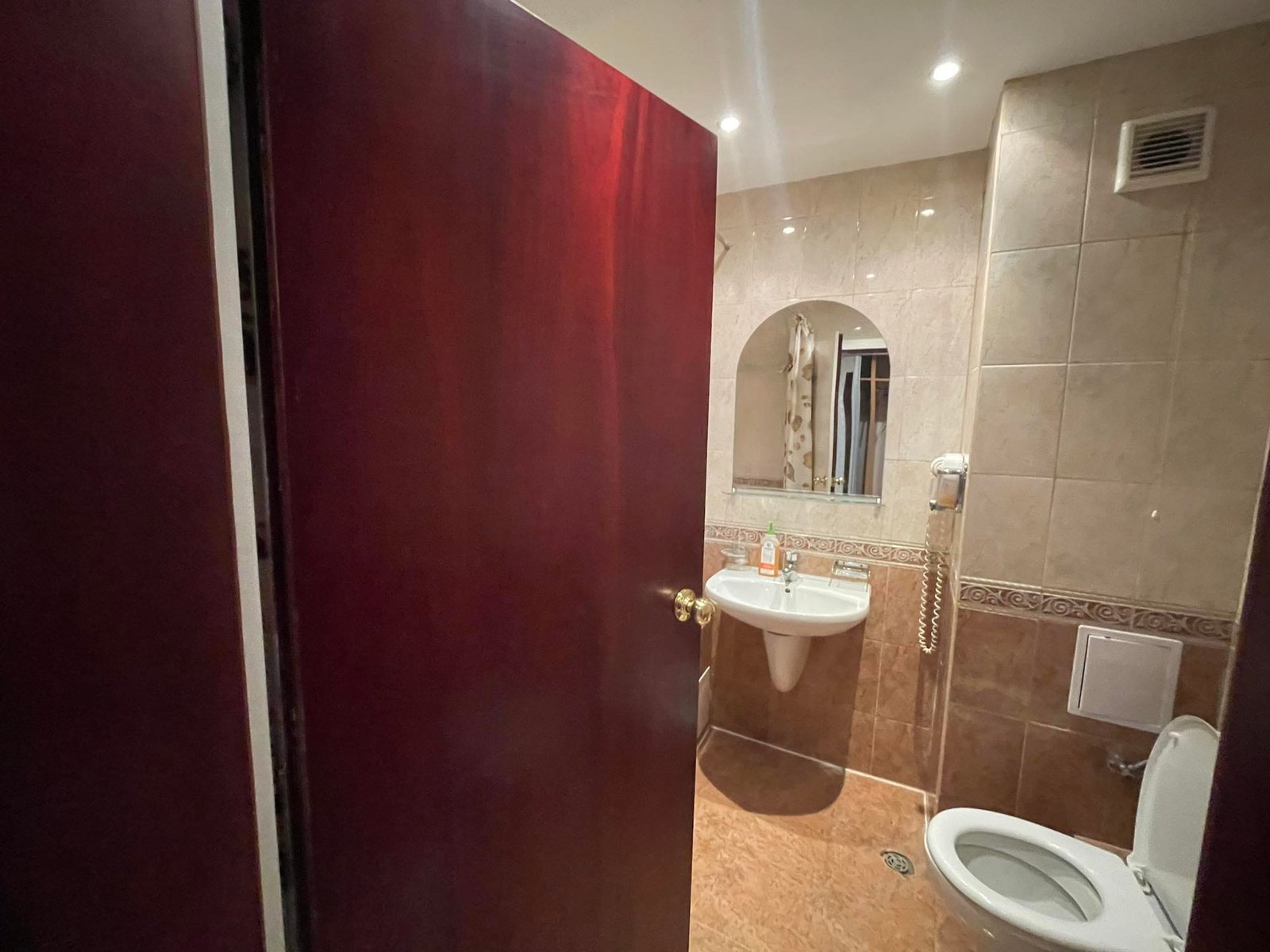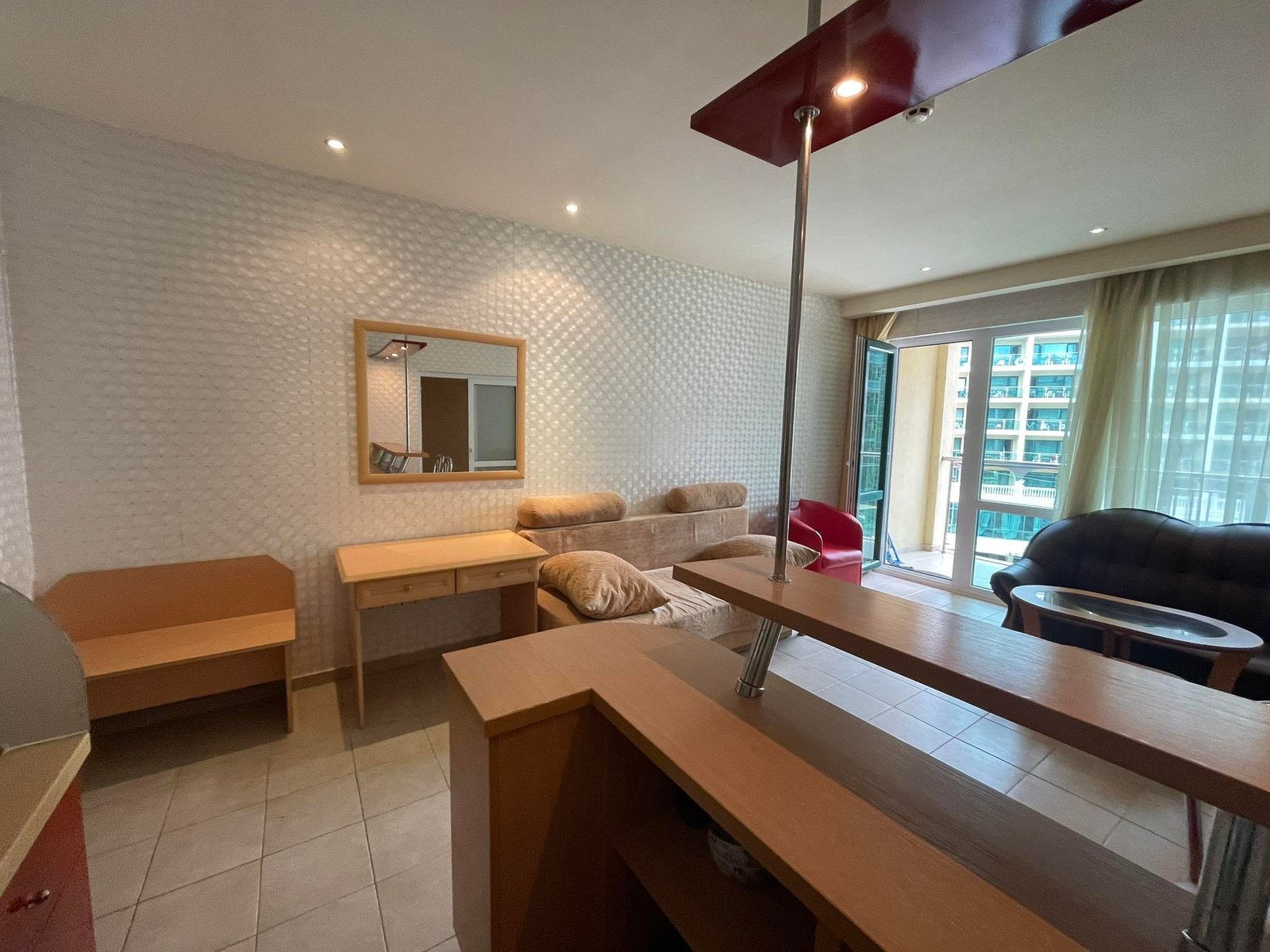 One-bedroom apartment with a total size with common parts of 82.15 sq.m., located on the 5th floor in Miramar Palace. The apartment consists of a large living room with a kitchenette, a bedroom, a wide corridor with a closet, an entrance hall, 2 bathrooms with a toilet, one of which has a bathtub, and a terrace with a view of the pool and the neighboring buildings.