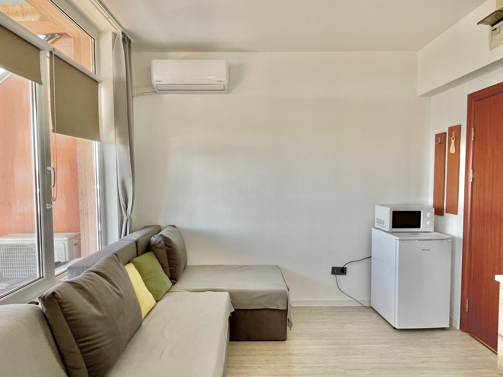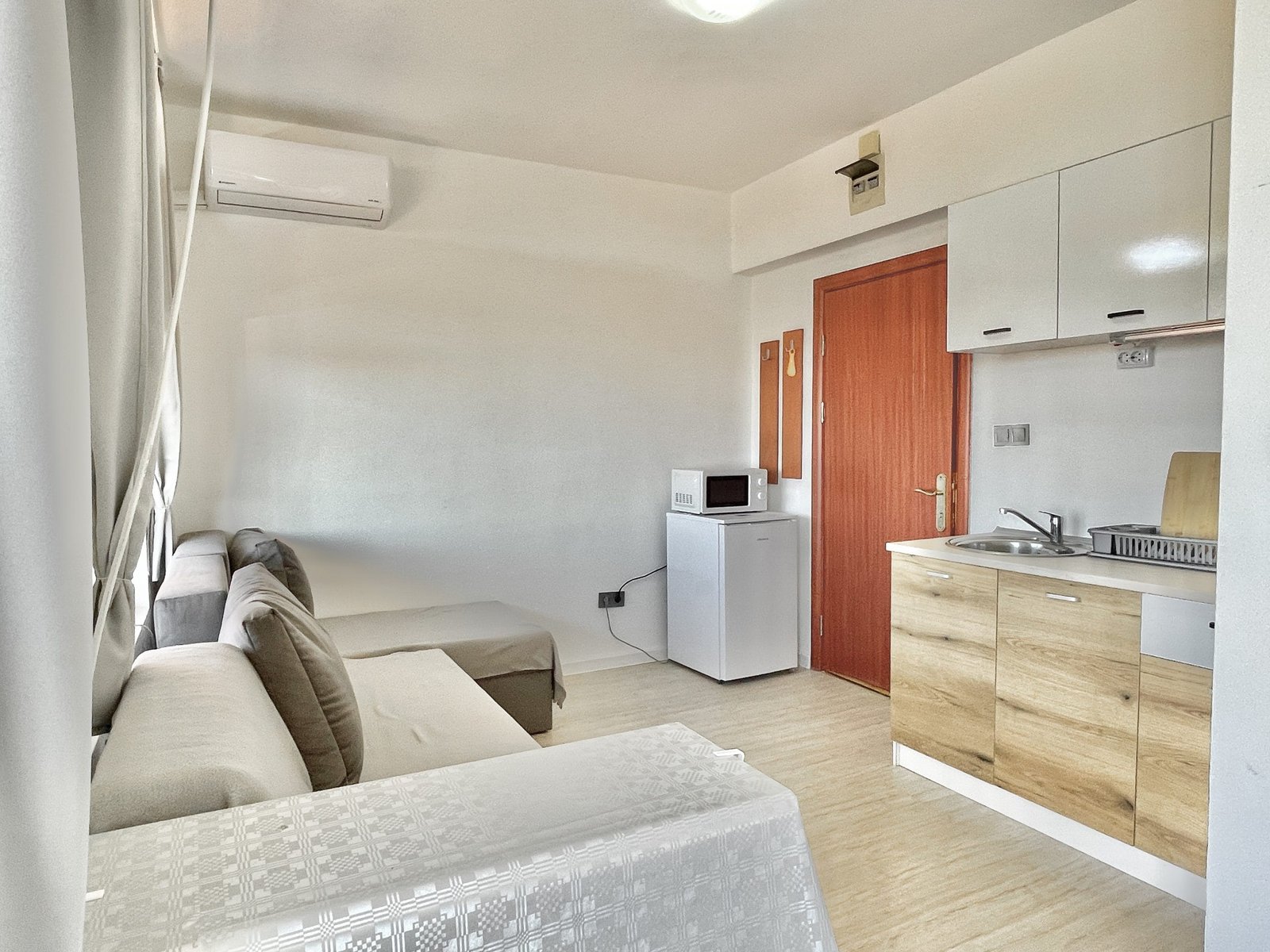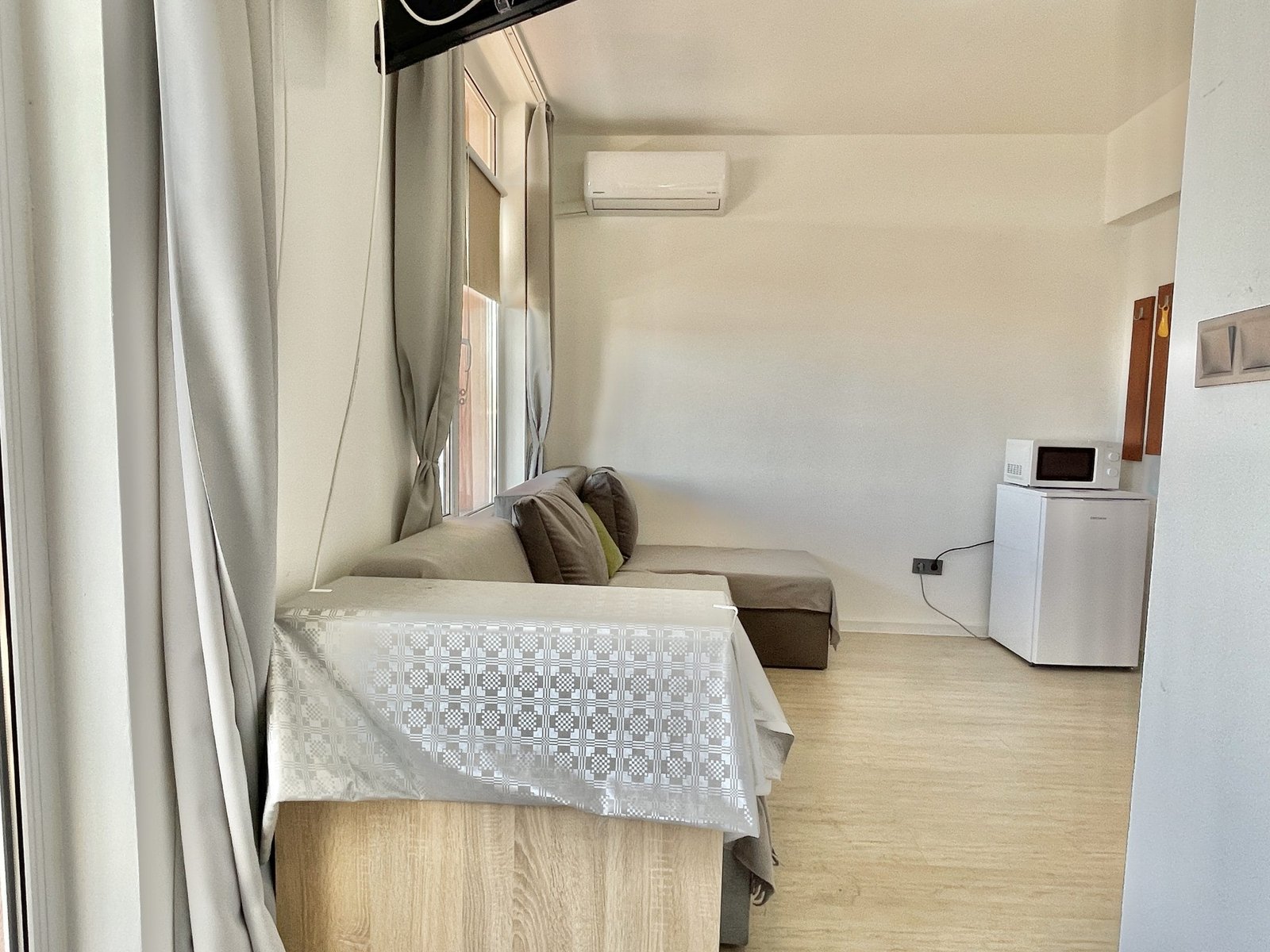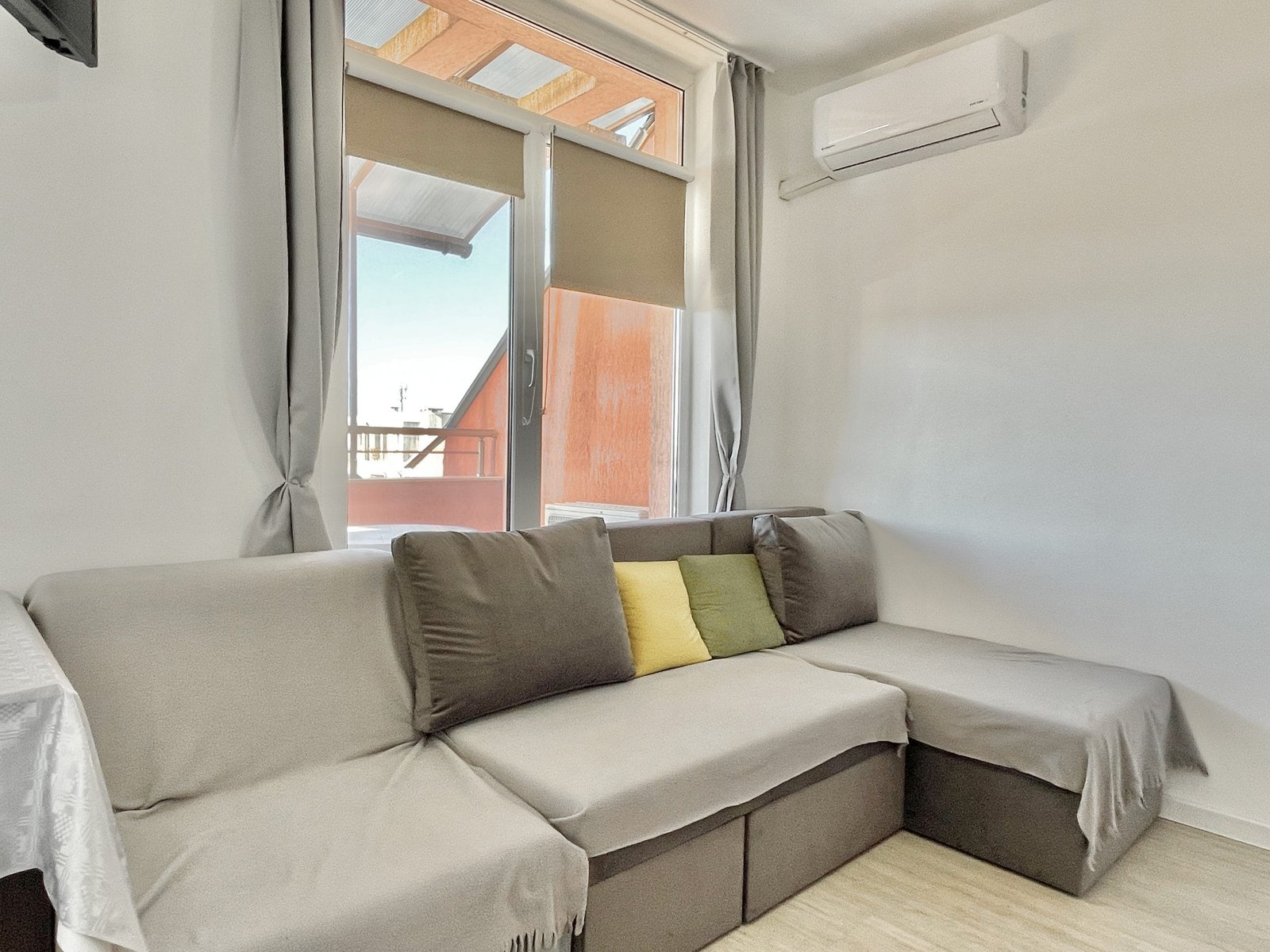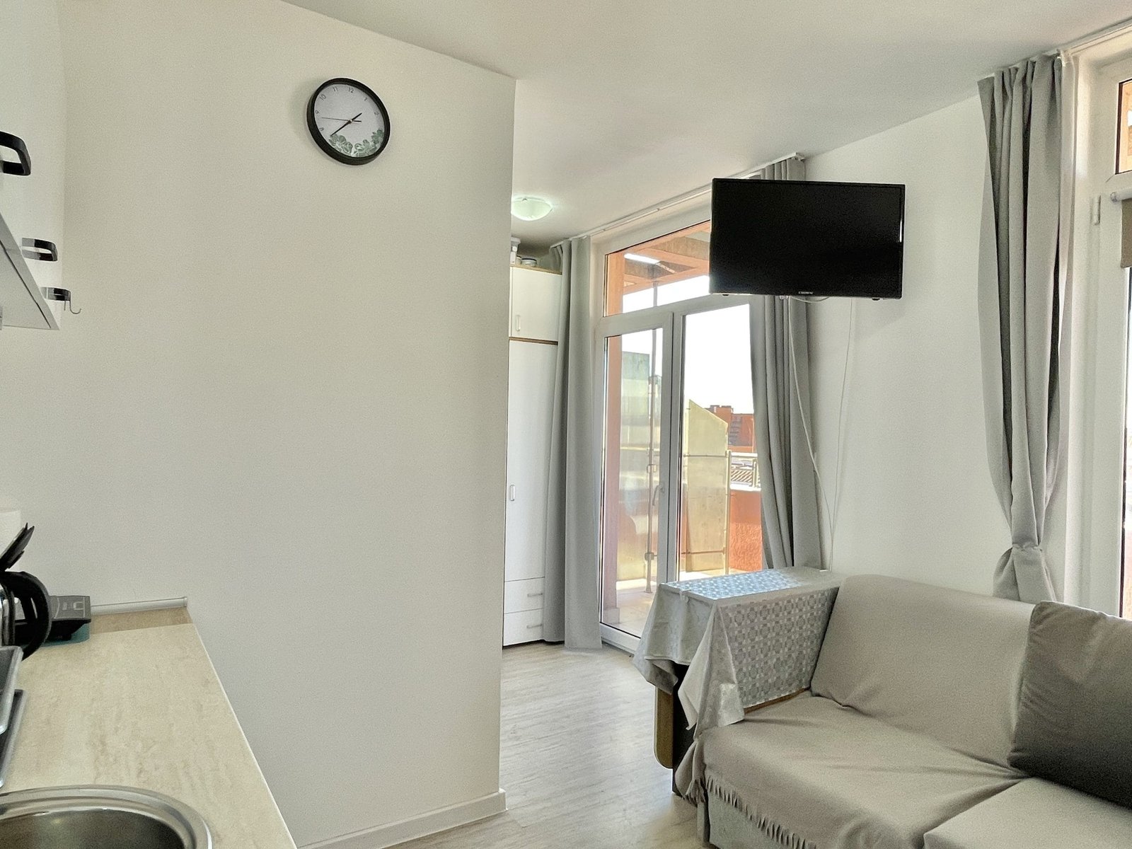 Apartament składa się z małego salonu z aneksem kuchennym, łazienki z toaletą oraz dużego zadaszonego tarasu z widokiem na sąsiednie budynki.
