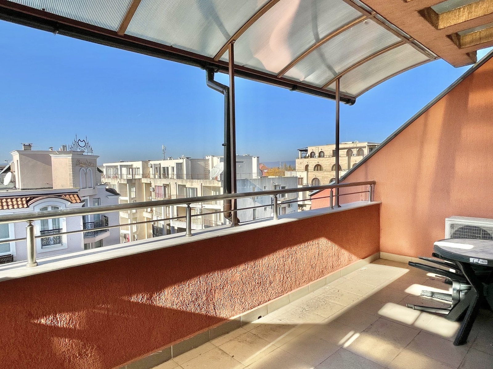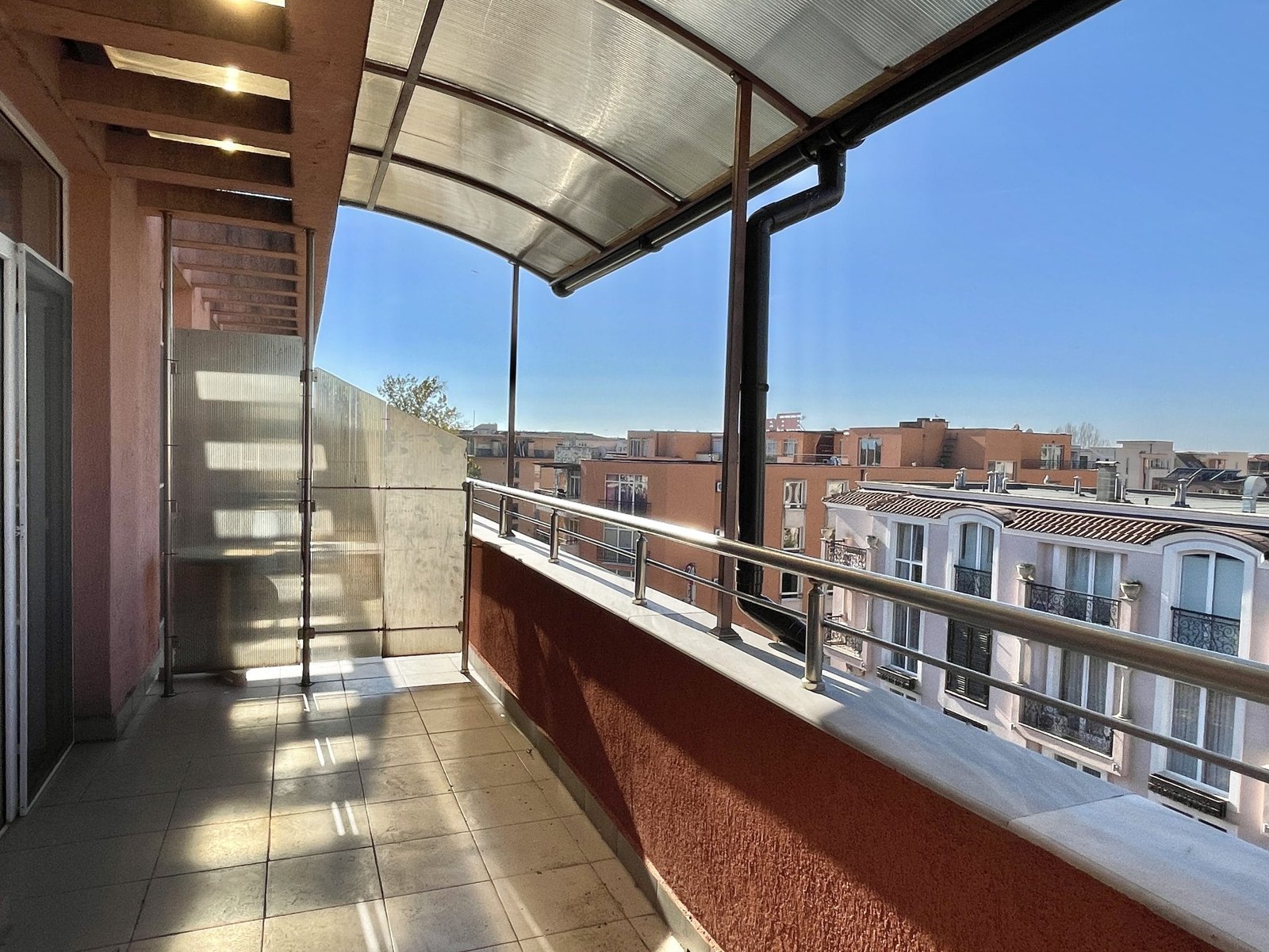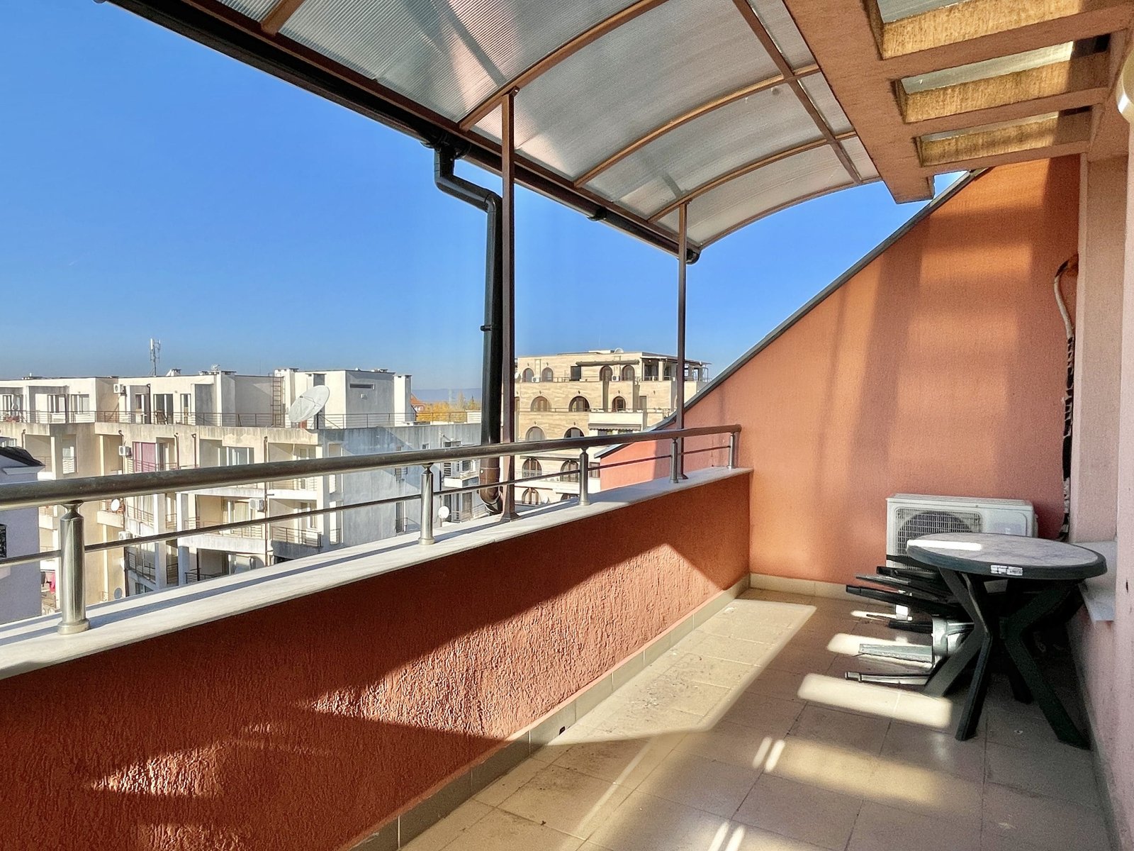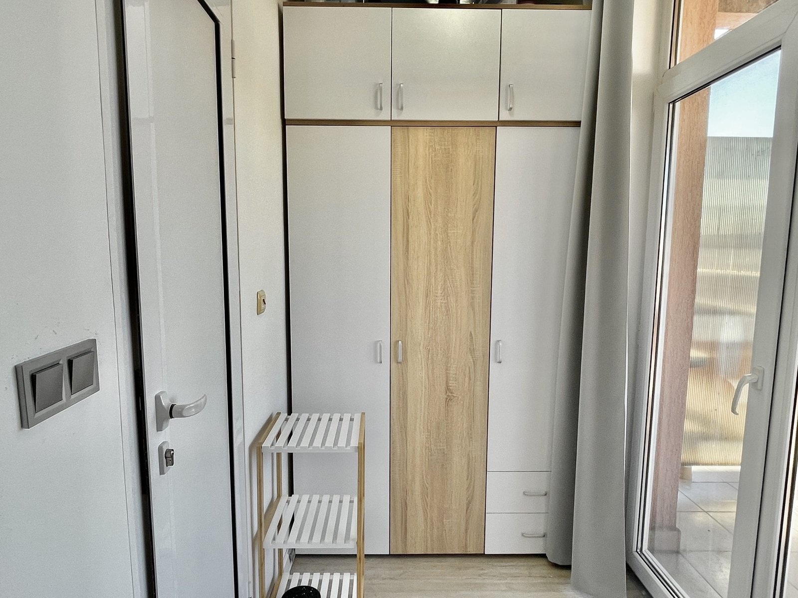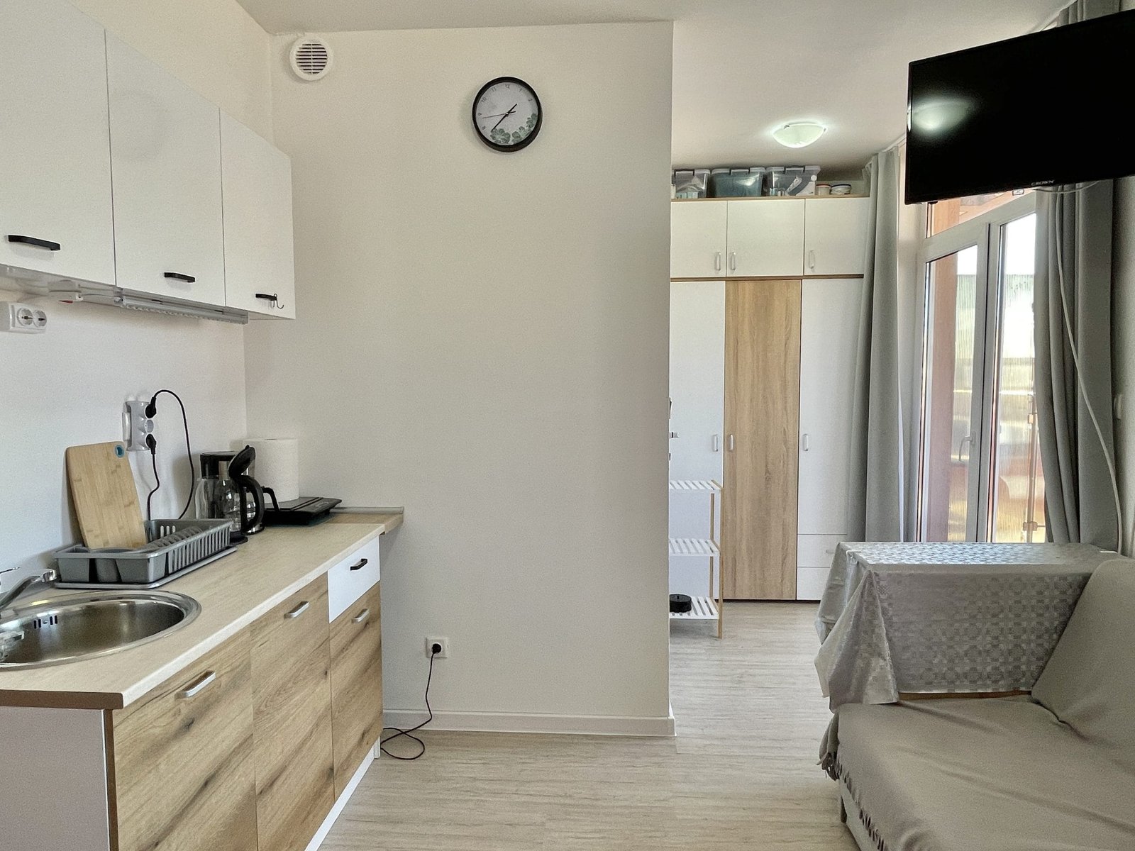 Apartament składa się z małego salonu z aneksem kuchennym, łazienki z toaletą oraz dużego zadaszonego tarasu z widokiem na sąsiednie budynki.