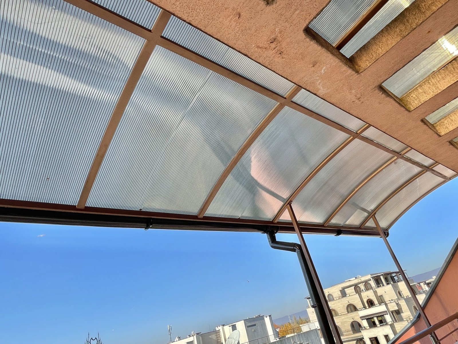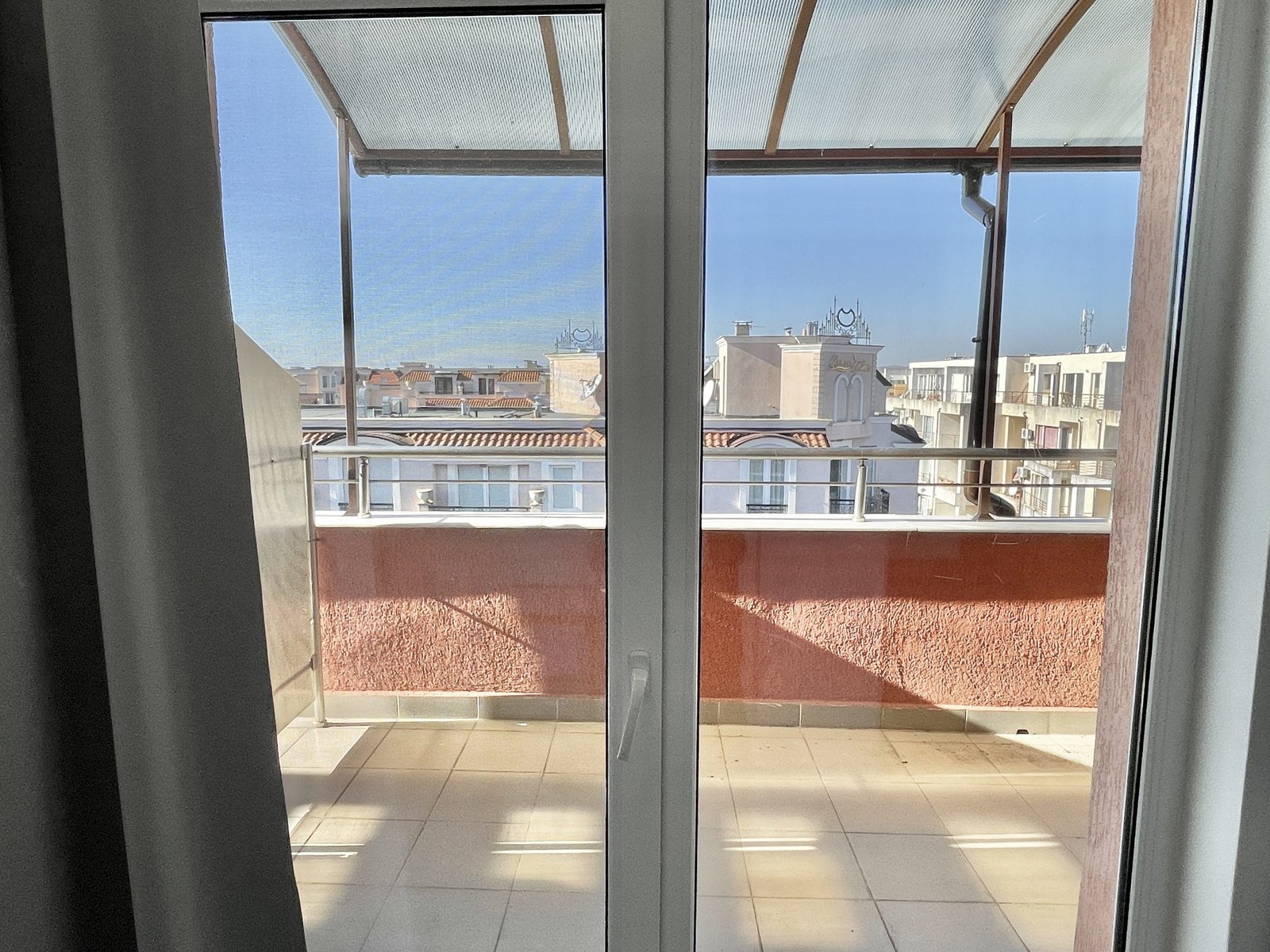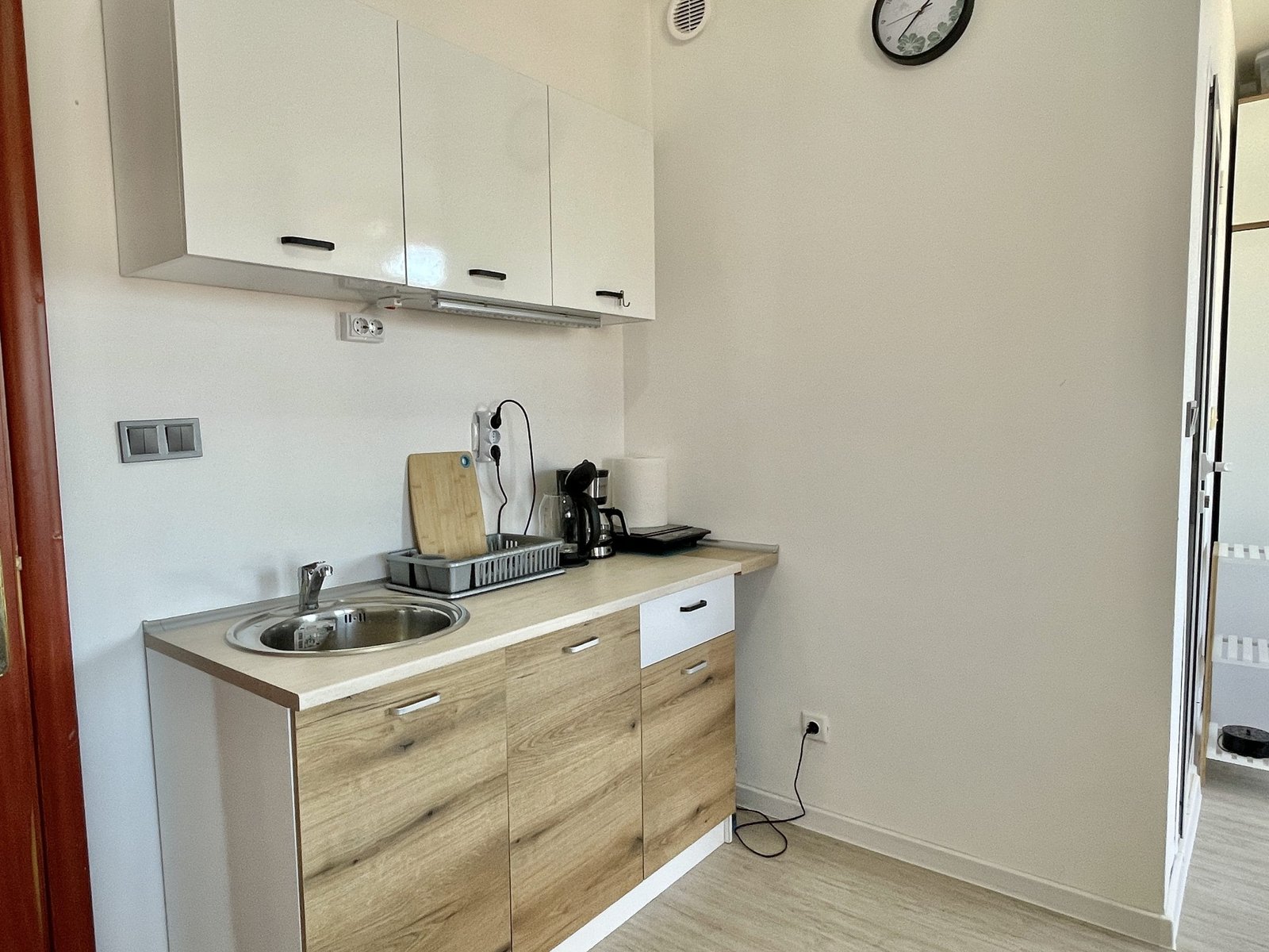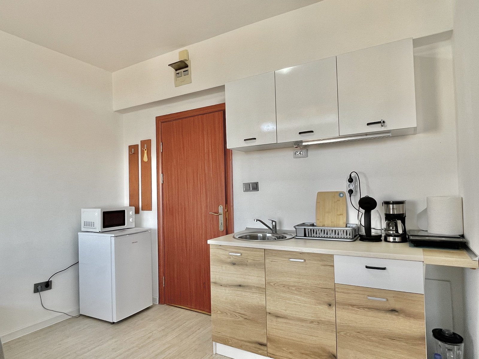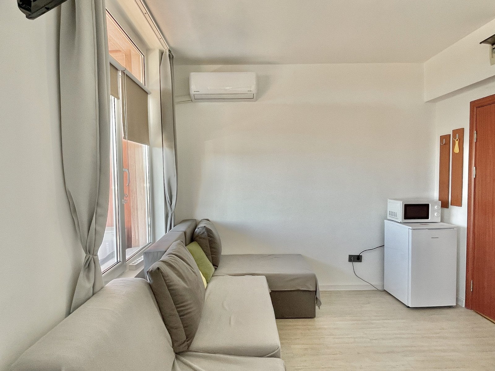 Apartament składa się z małego salonu z aneksem kuchennym, łazienki z toaletą oraz dużego zadaszonego tarasu z widokiem na sąsiednie budynki.