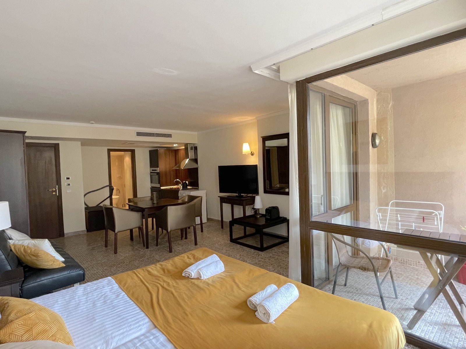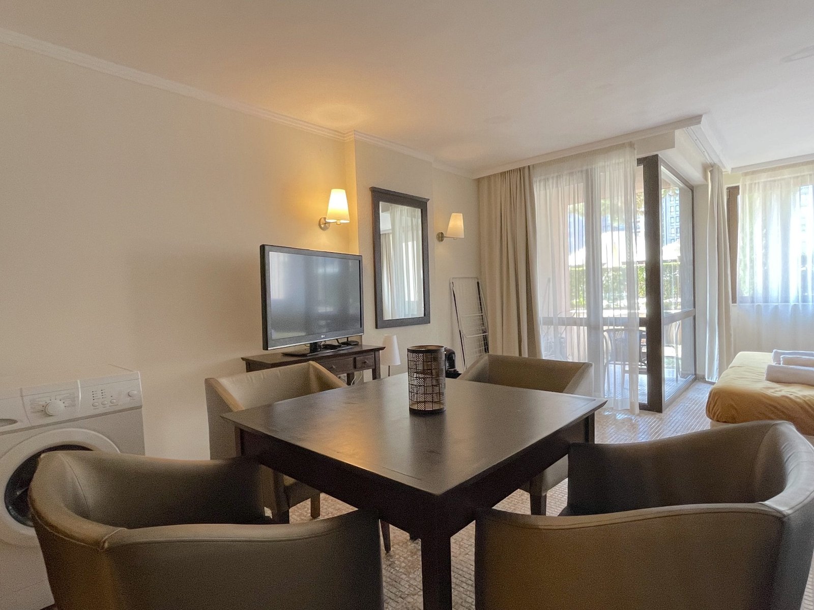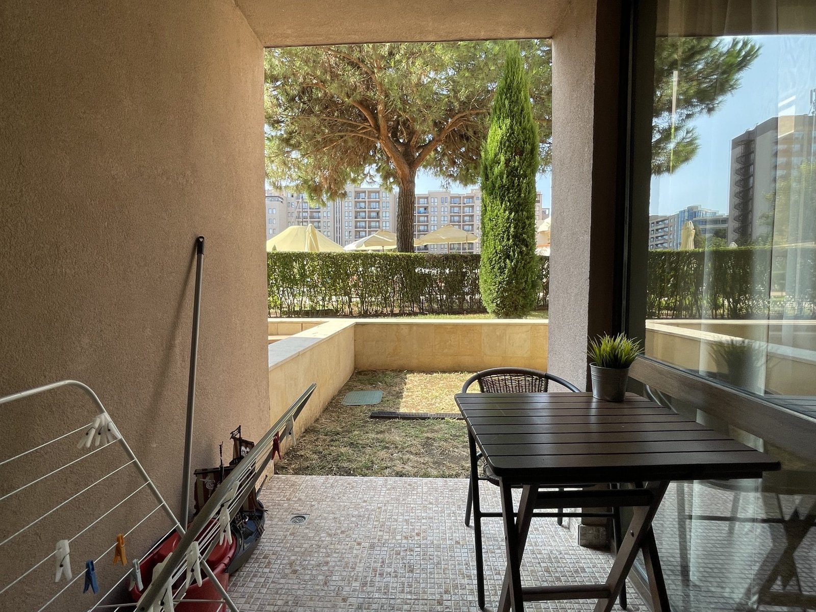 The apartment consists of a large living room with a kitchenette, a bathroom with a toilet and a terrace with greenery overlooking the pool.
