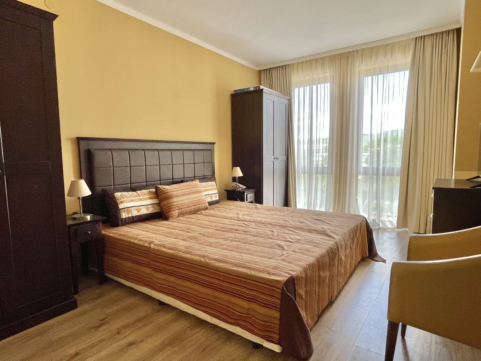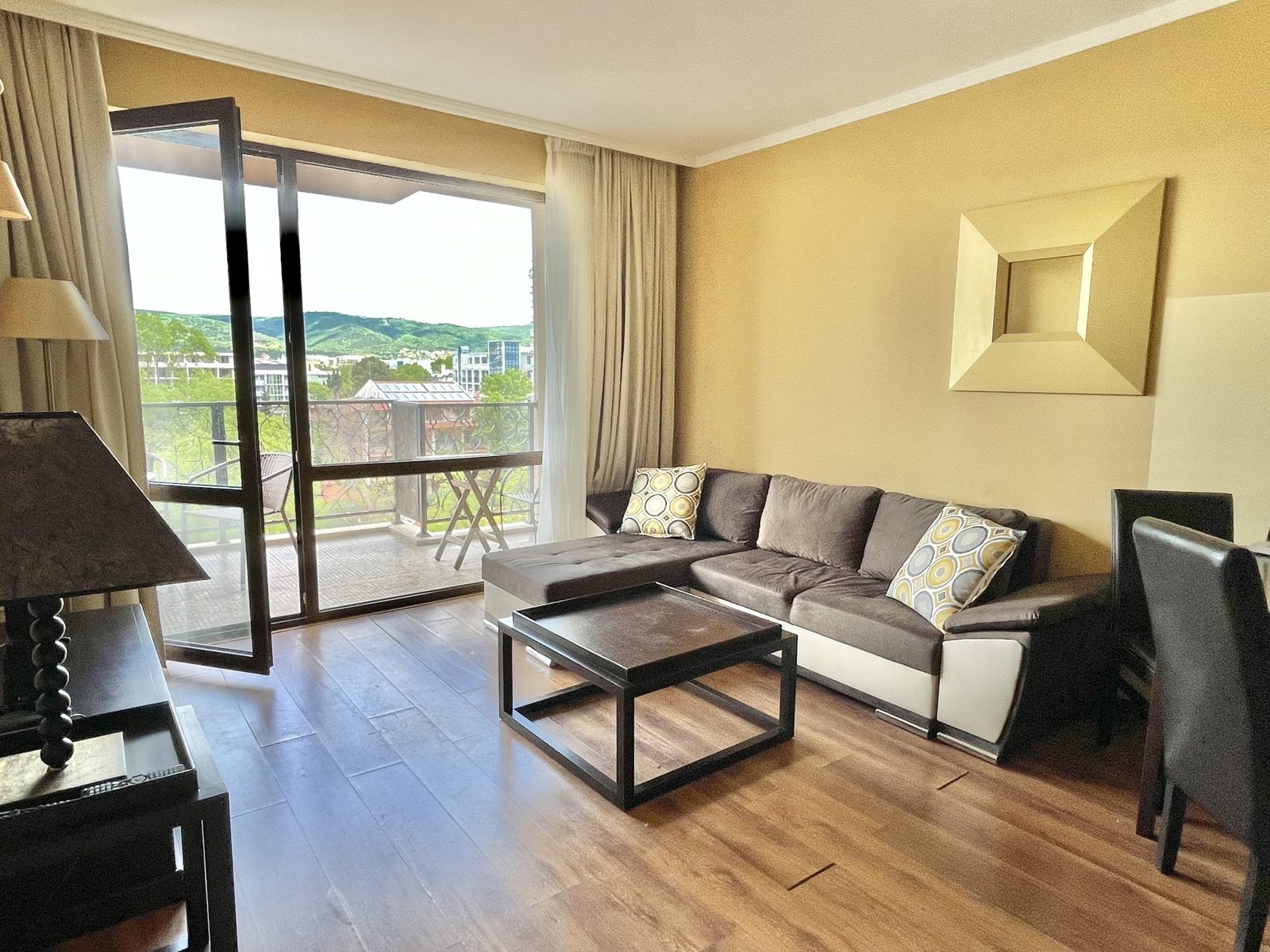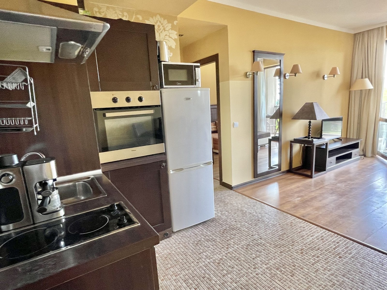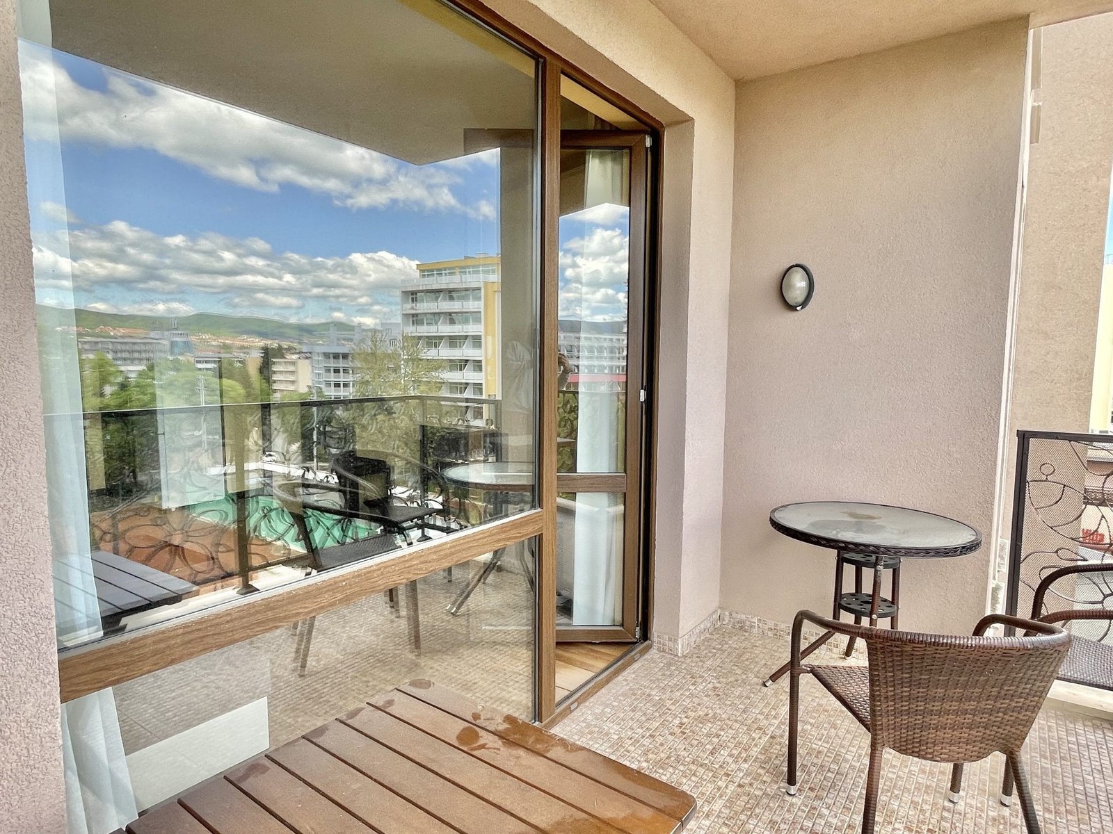 2 pokojowy apartament o powierzchni całkowitej 68.31 m2 i powierzchni użytkowej 57.89 m2, wykończone i oferowane w pełni umeblowane. Mieszkanie znajduje się na 4 piętrze, zaledwie 50 metrów od plaży i 200 metrów od centrum Słonecznego Brzegu.