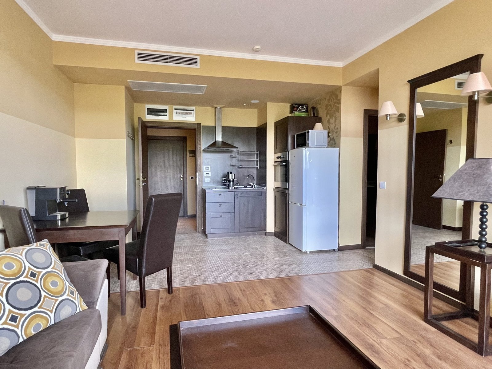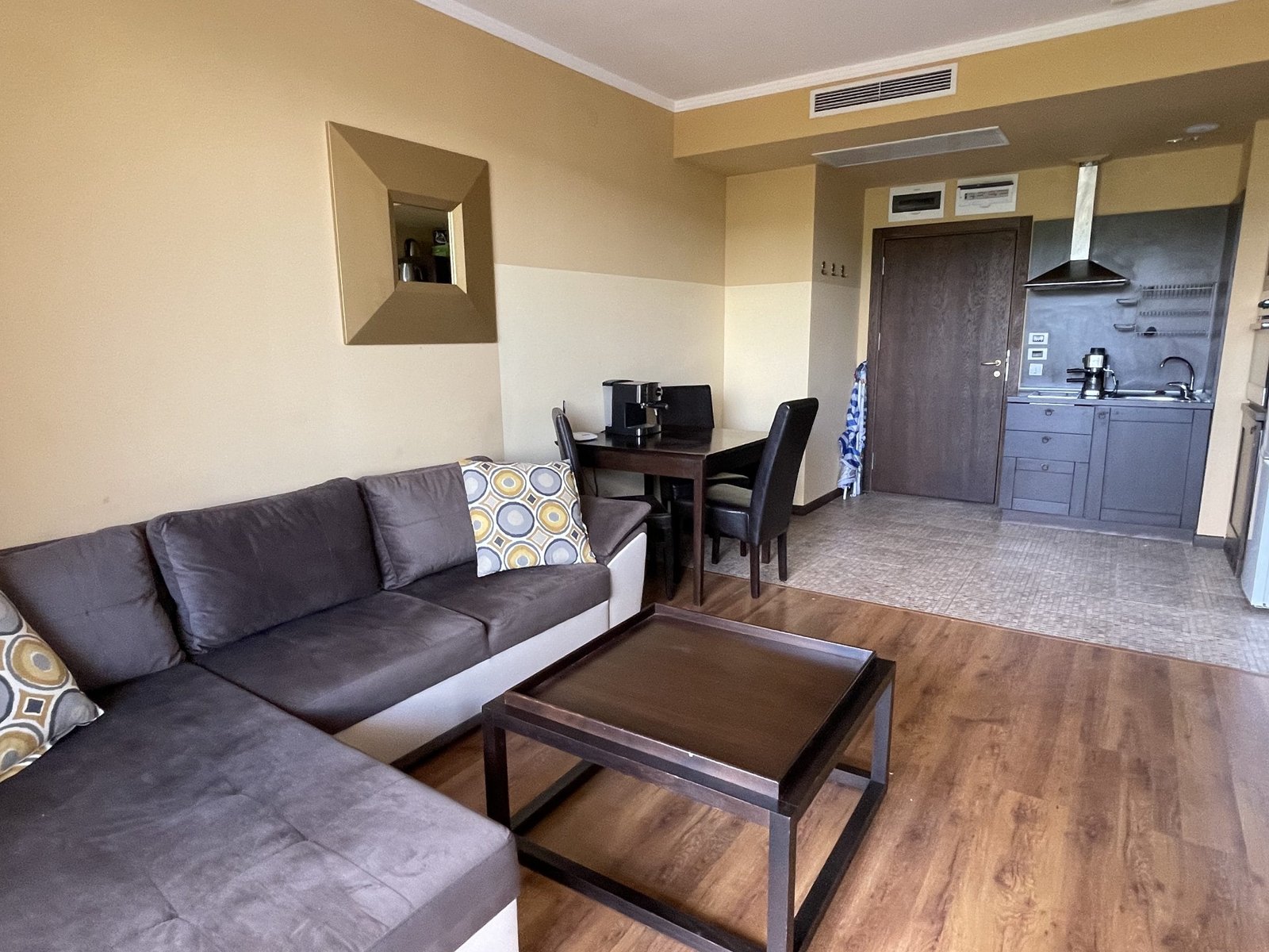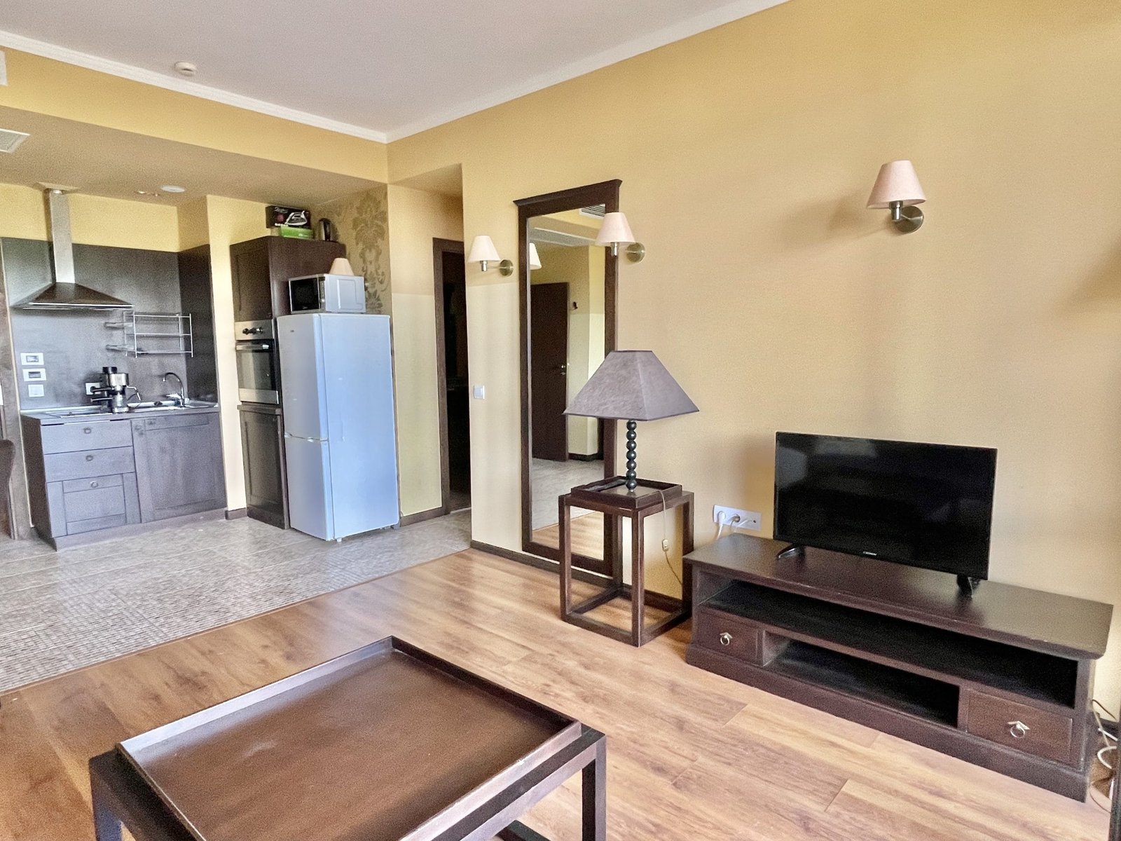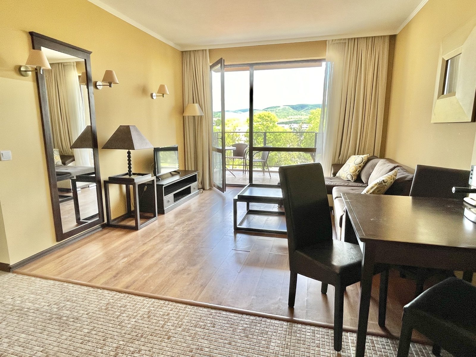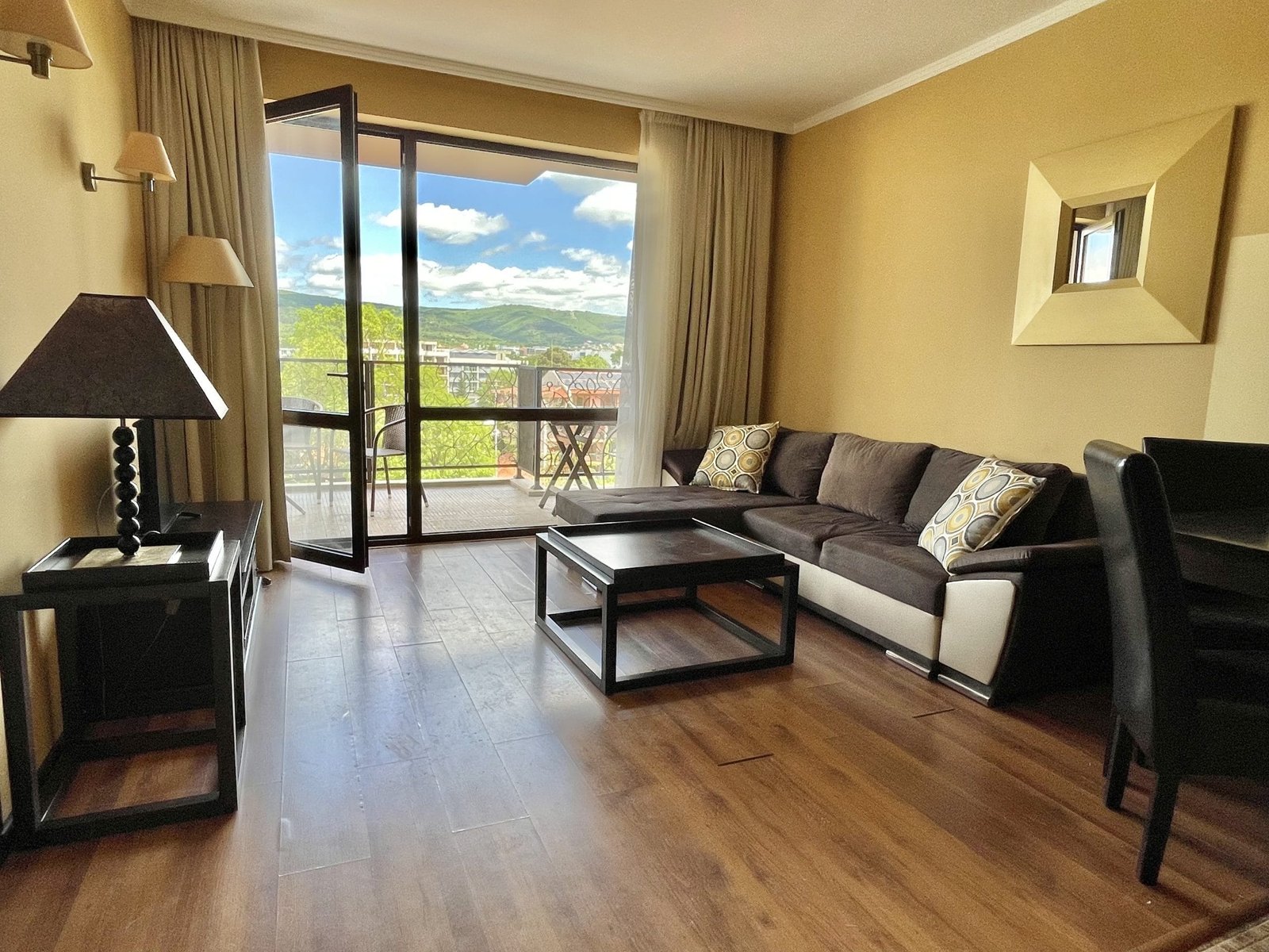 2 pokojowy apartament o powierzchni całkowitej 68.31 m2 i powierzchni użytkowej 57.89 m2, wykończone i oferowane w pełni umeblowane. Mieszkanie znajduje się na 4 piętrze, zaledwie 50 metrów od plaży i 200 metrów od centrum Słonecznego Brzegu.