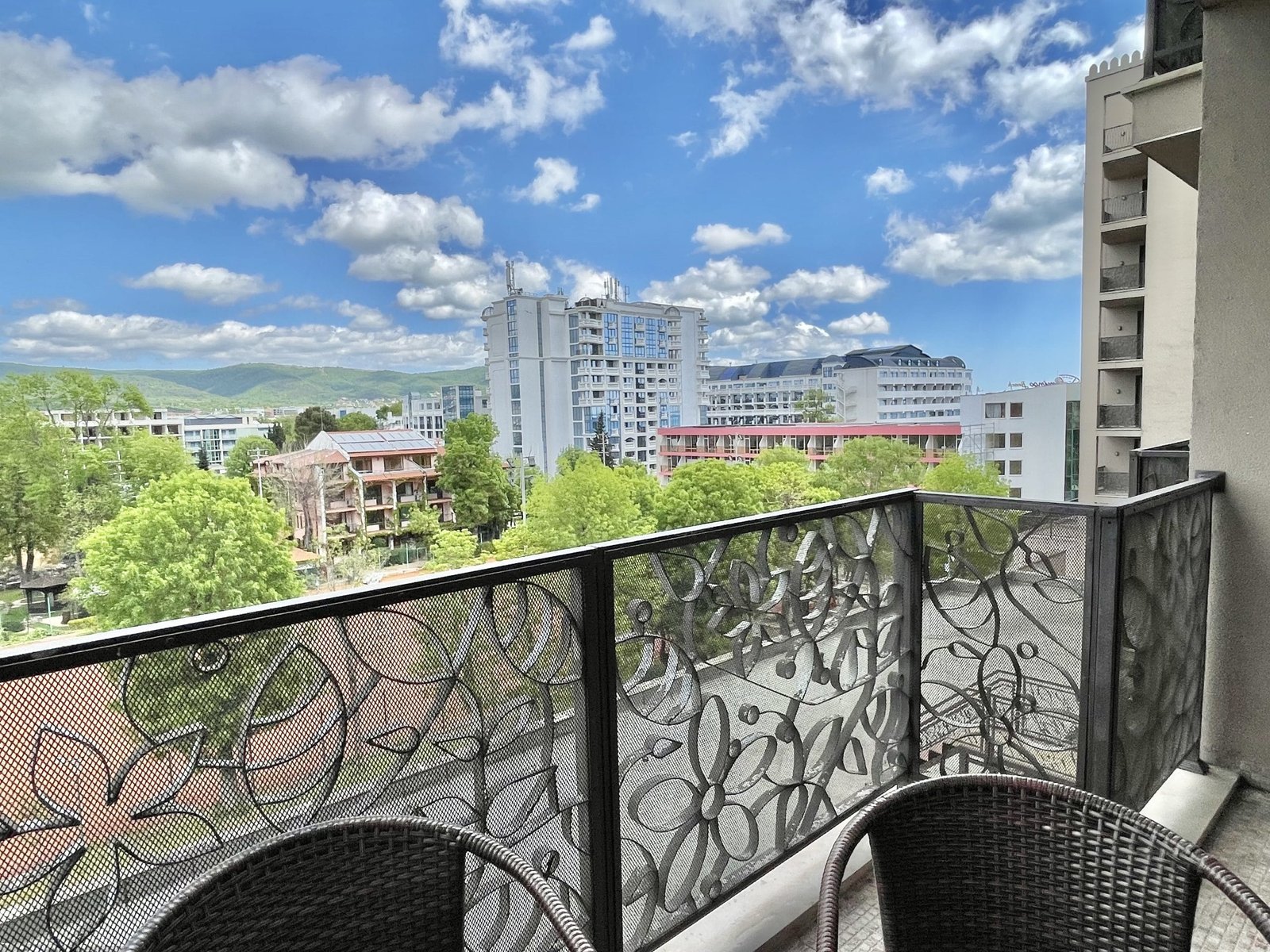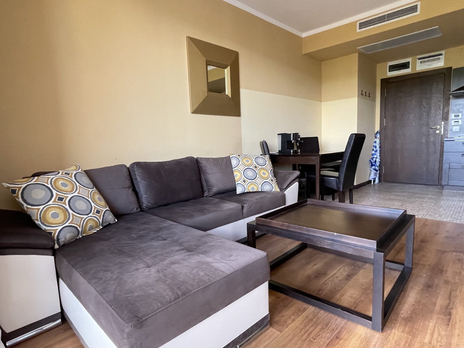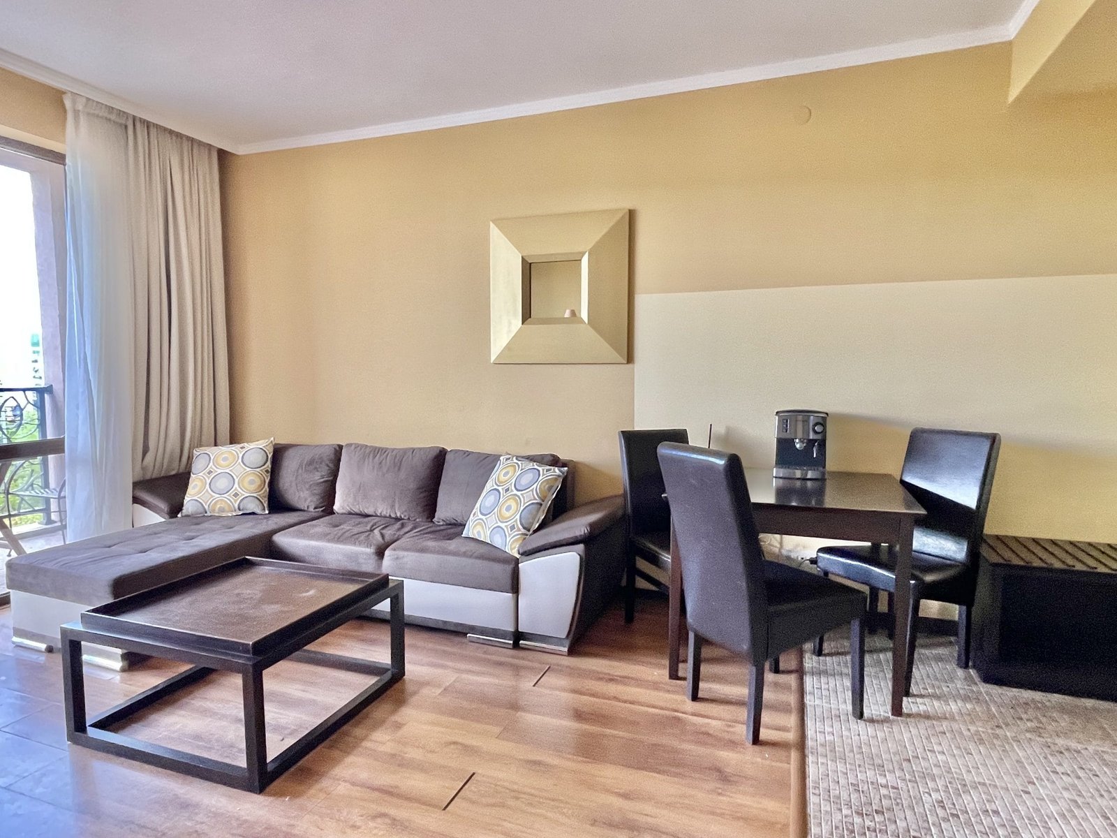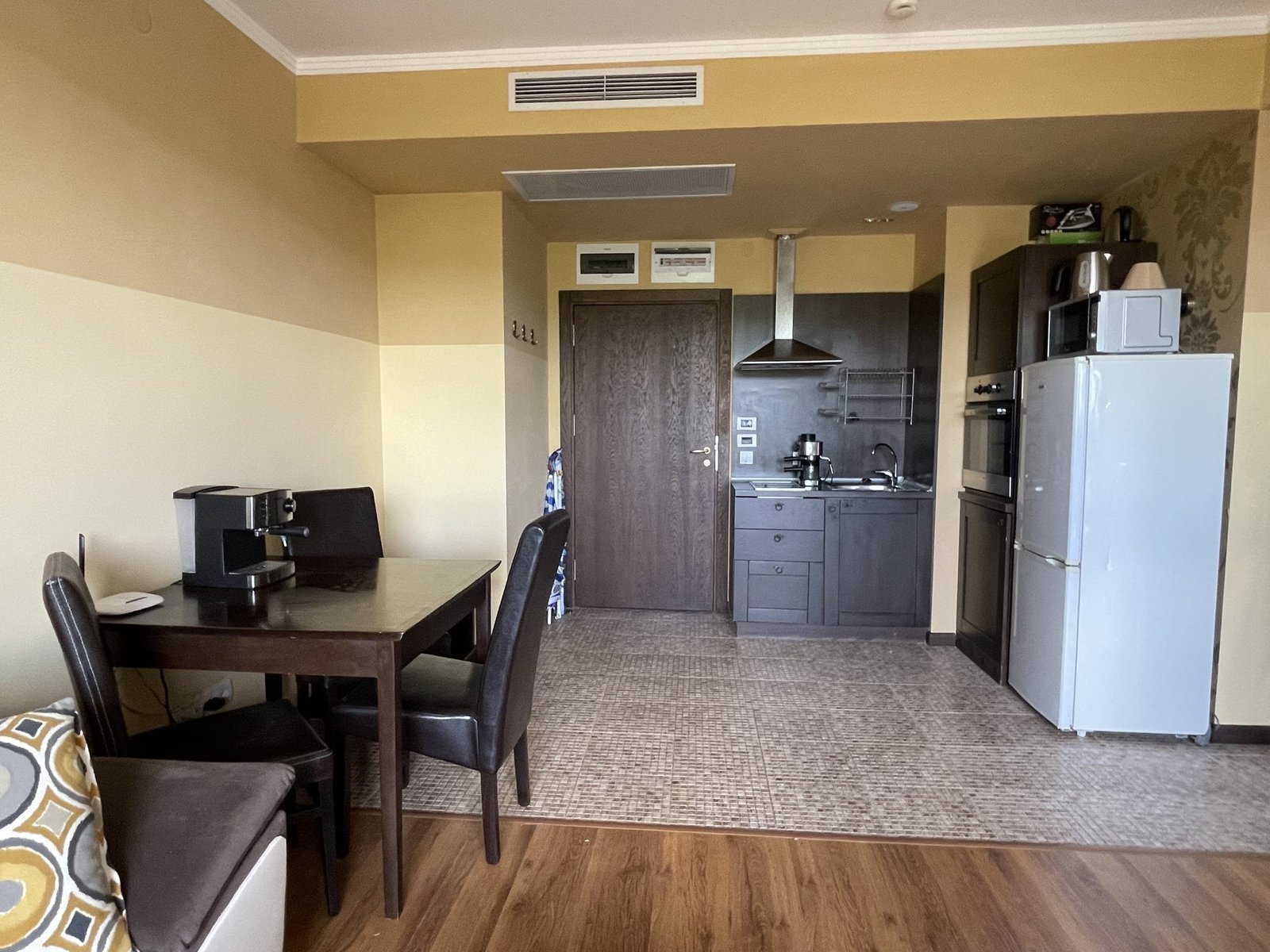 2 pokojowy apartament o powierzchni całkowitej 68.31 m2 i powierzchni użytkowej 57.89 m2, wykończone i oferowane w pełni umeblowane. Mieszkanie znajduje się na 4 piętrze, zaledwie 50 metrów od plaży i 200 metrów od centrum Słonecznego Brzegu.