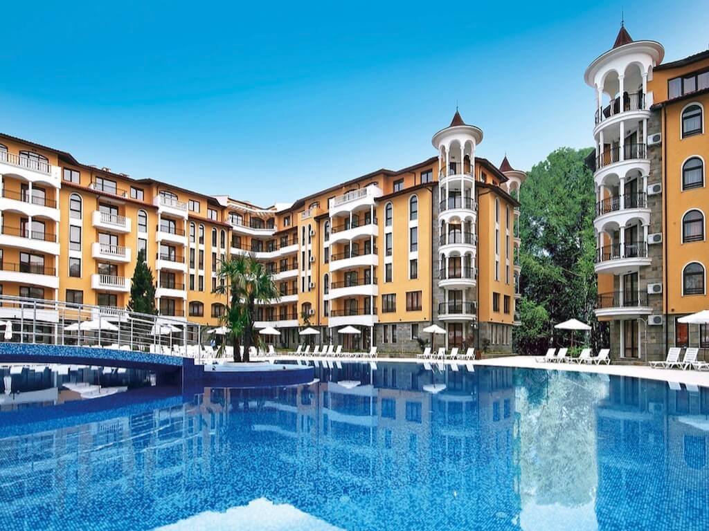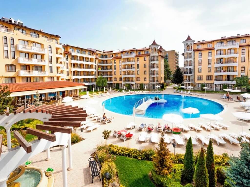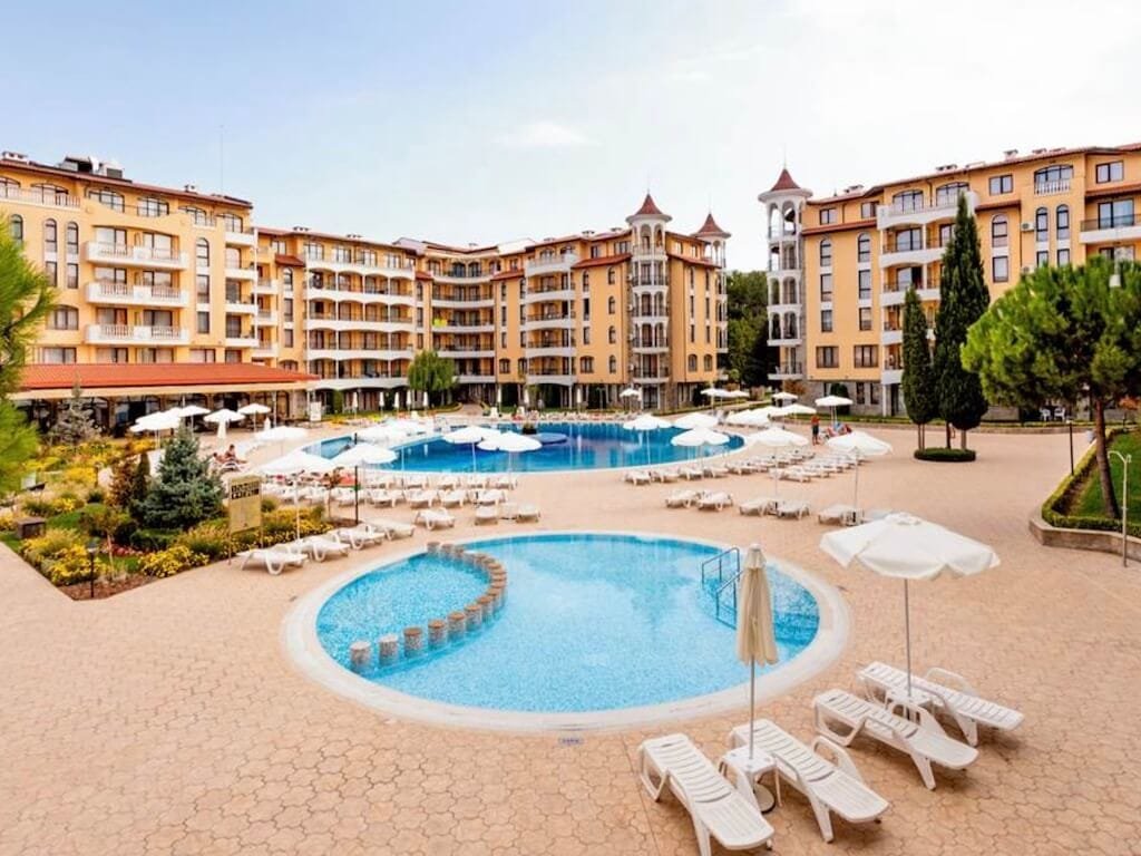 It is a facility built to create a gated enclave, with beautiful pools, restaurant, bar, playground and shops. The Royal Sun complex is located in the southern part of the famous summer resort Sunny Beach on the Black Sea in Bulgaria.