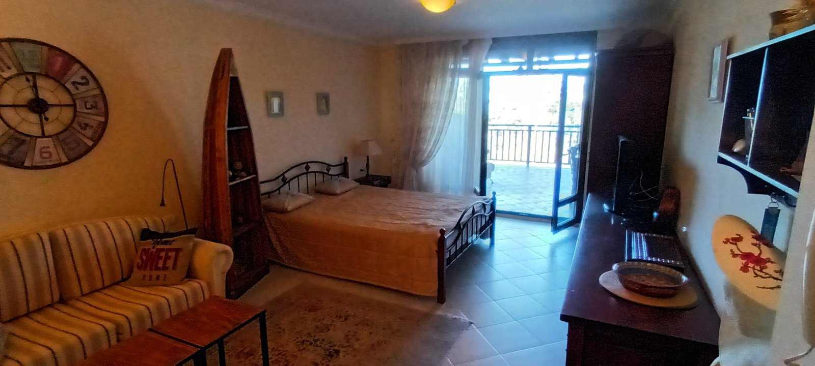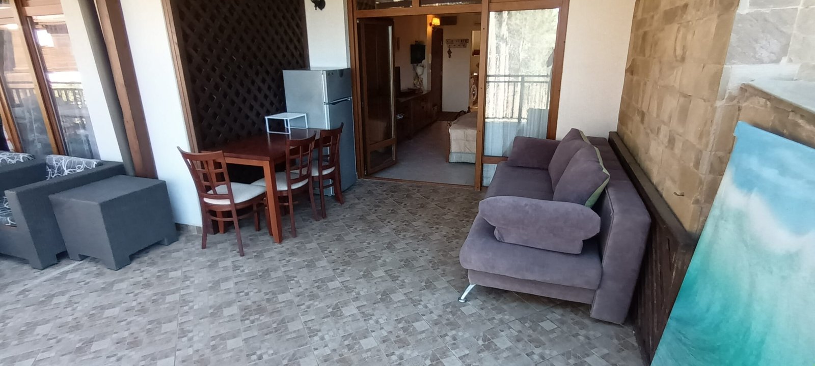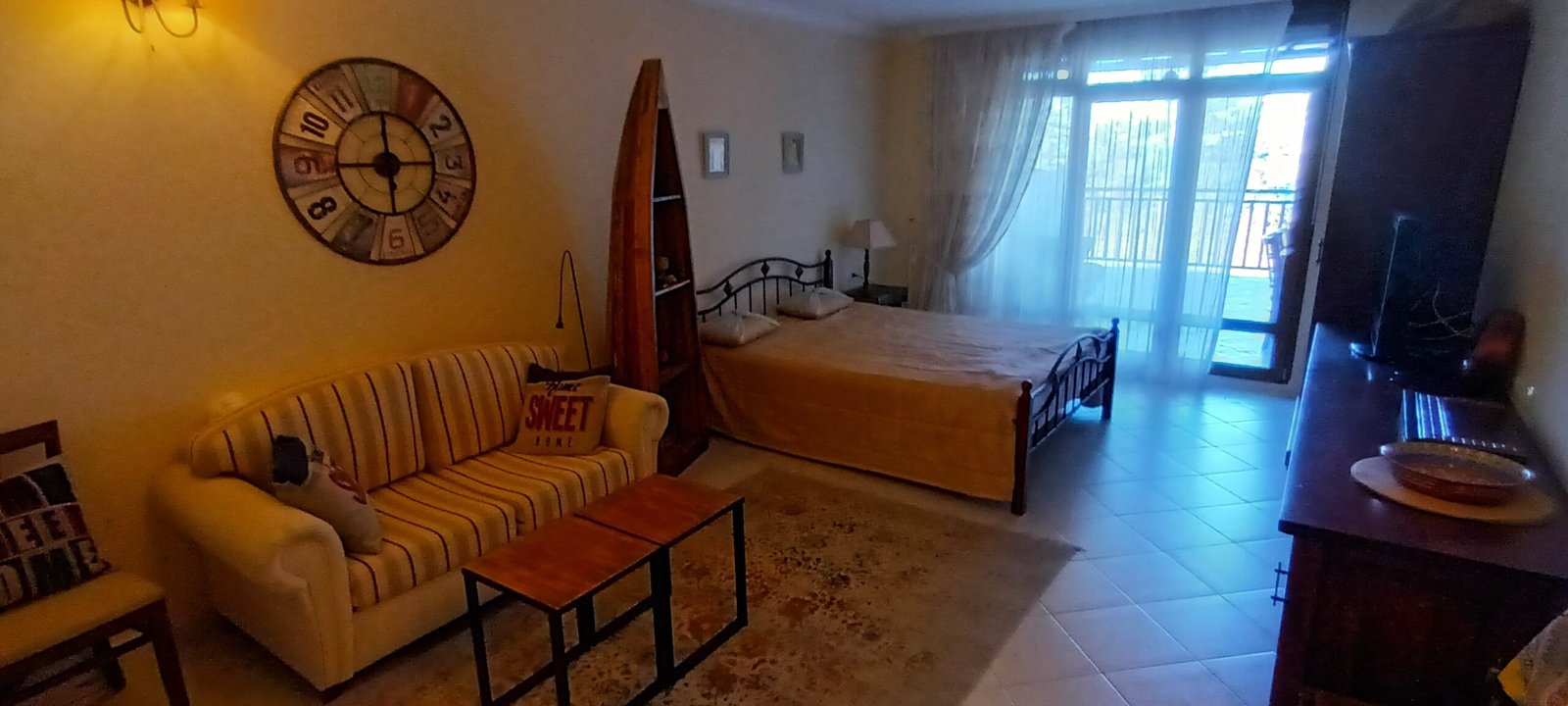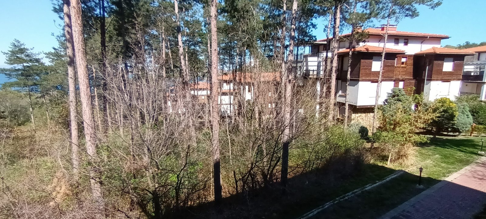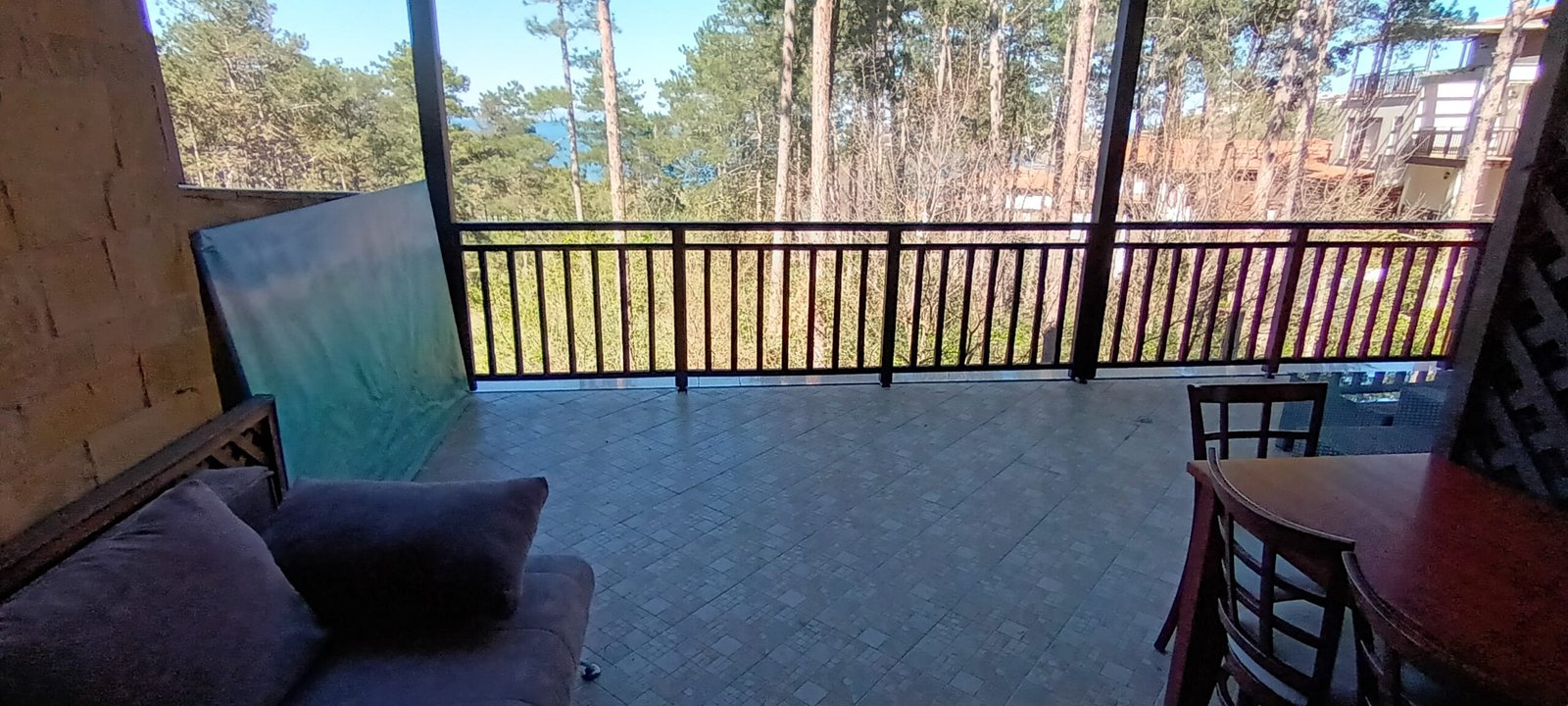 Apartament typu studio o powierzchni całkowitej 67.98 m2, i powierzchni uzytkowej 56.57 m2, wykończone i oferowane w pełni umeblowane. Mieszkanie znajduje sie na 1 piętrze w kompleksie Santa Marina i składa się z dużego salonu z aneksem kuchennym, łazienki oraz dużego tarasu z widokiem na las i cześciowym widokiem na morze.