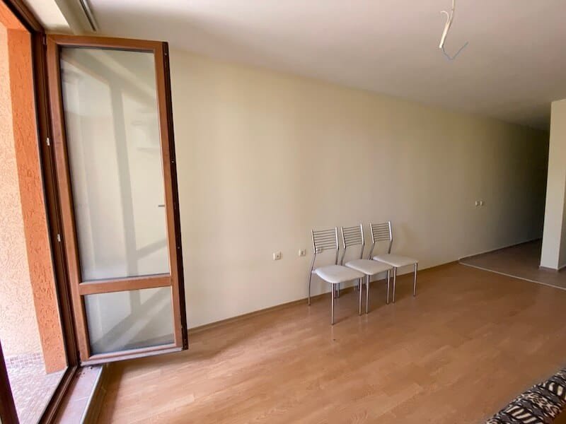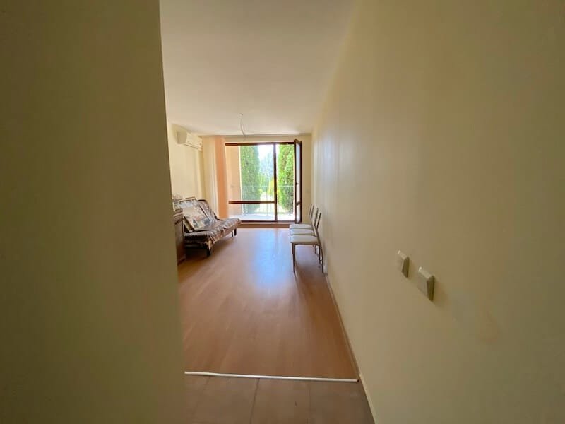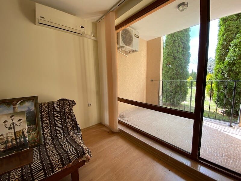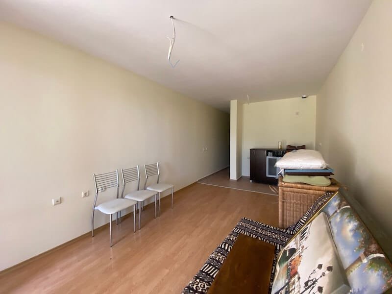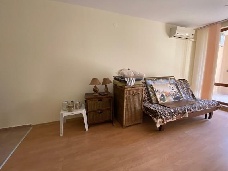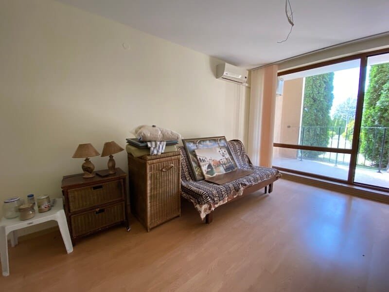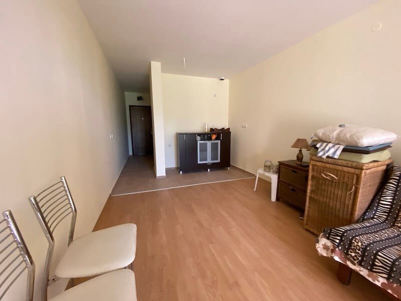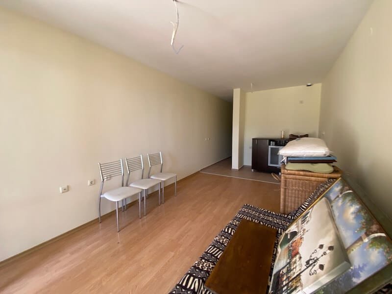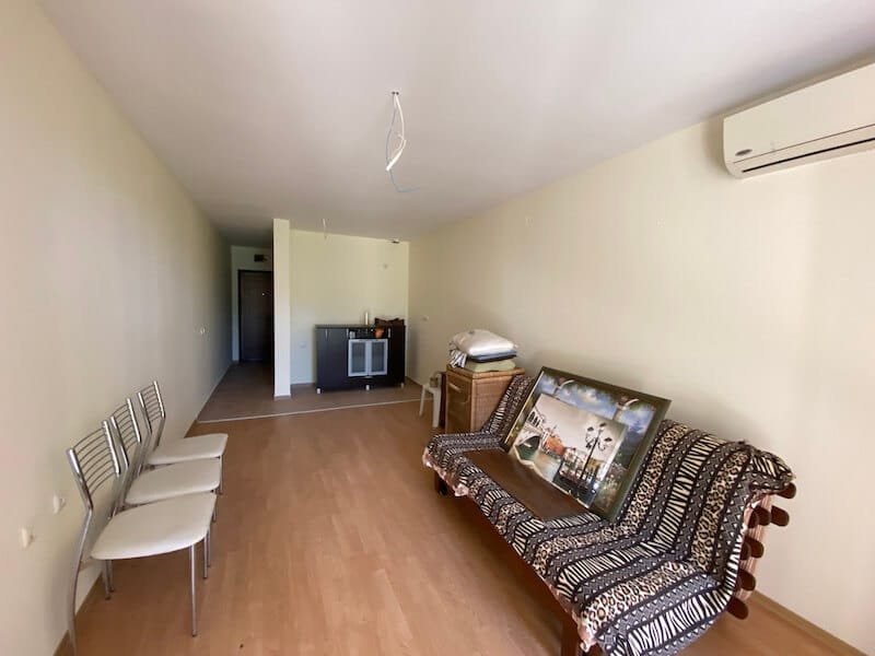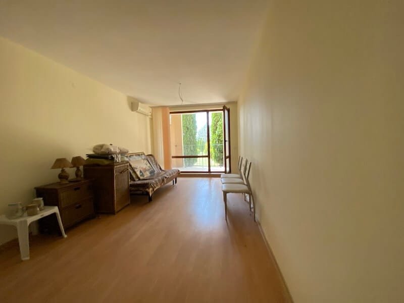 Studio apartment with a total size with common parts of 45.55 m2 and a build up area of 37.30 m2, finished and offered with furniture. The apartment is located on the ground floor, in the all-year-round Sea Fort Club complex in Sveti Vlas. The apartment consists of a hall-corridor, living room with a space for a kitchenette, bathroom with a toilet and a balcony overlooking the garden. The apartment does not have a kitchen, but it has all possible connections.